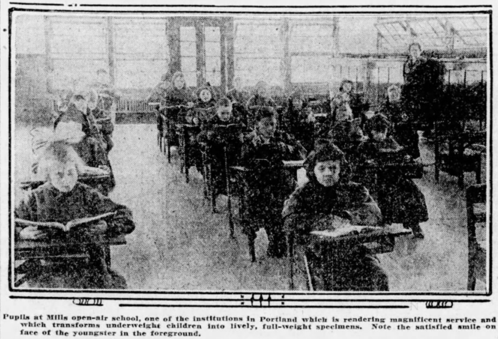 When it opened in 1919, the Abbott L. Mills Open Air School put Portland on the map nationally and internationally as the nation’s first entirely purpose-built open-air school, meaning that students and teachers spent their entire school day surrounded by fresh air. A handful of other communities across the country had experimented with a classroom here or there in an existing school. In Portland, the original Irvington School featured one open air classroom where the windows were open all day, all school year.