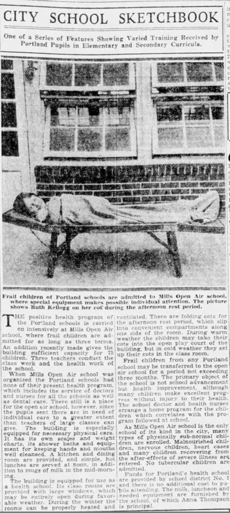 But with financial help and encouragement from the Oregon Tuberculosis Association, Portland Public Schools was able to build an entire school dedicated to helping “low vitality children” improve their health and therefore their resiliency to tuberculosis, which was a serious health threat of that era killing hundreds of thousands of people of all ages in the U.S. during the 1920s.