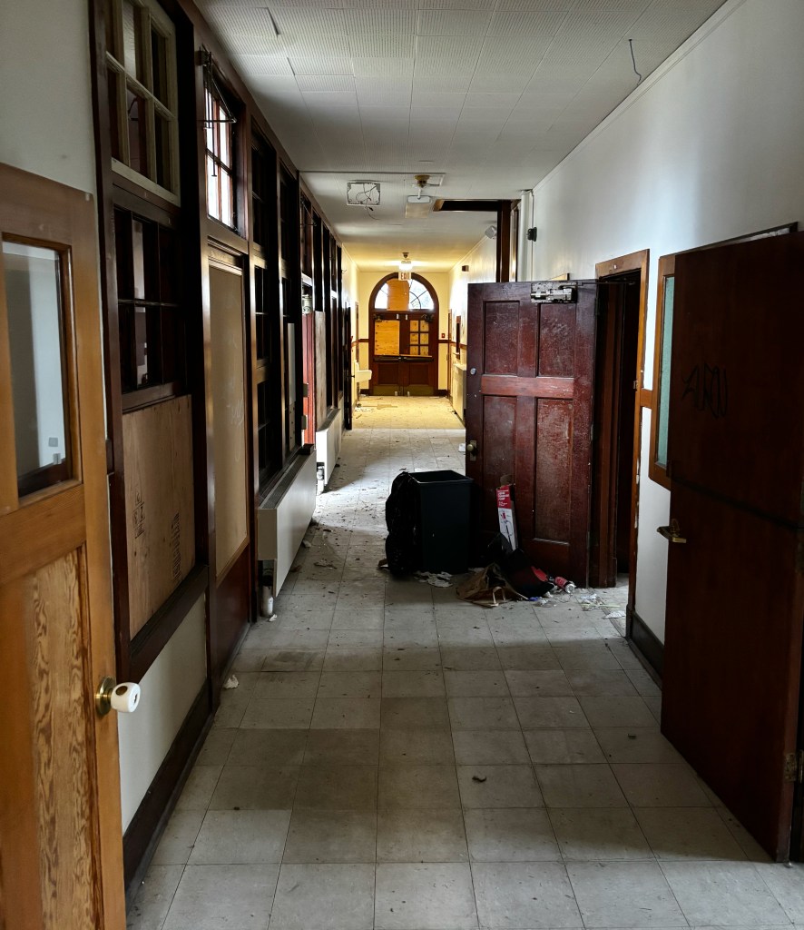 The empty long hallway at Open Air School, December 2024. The building has been empty since 2019.