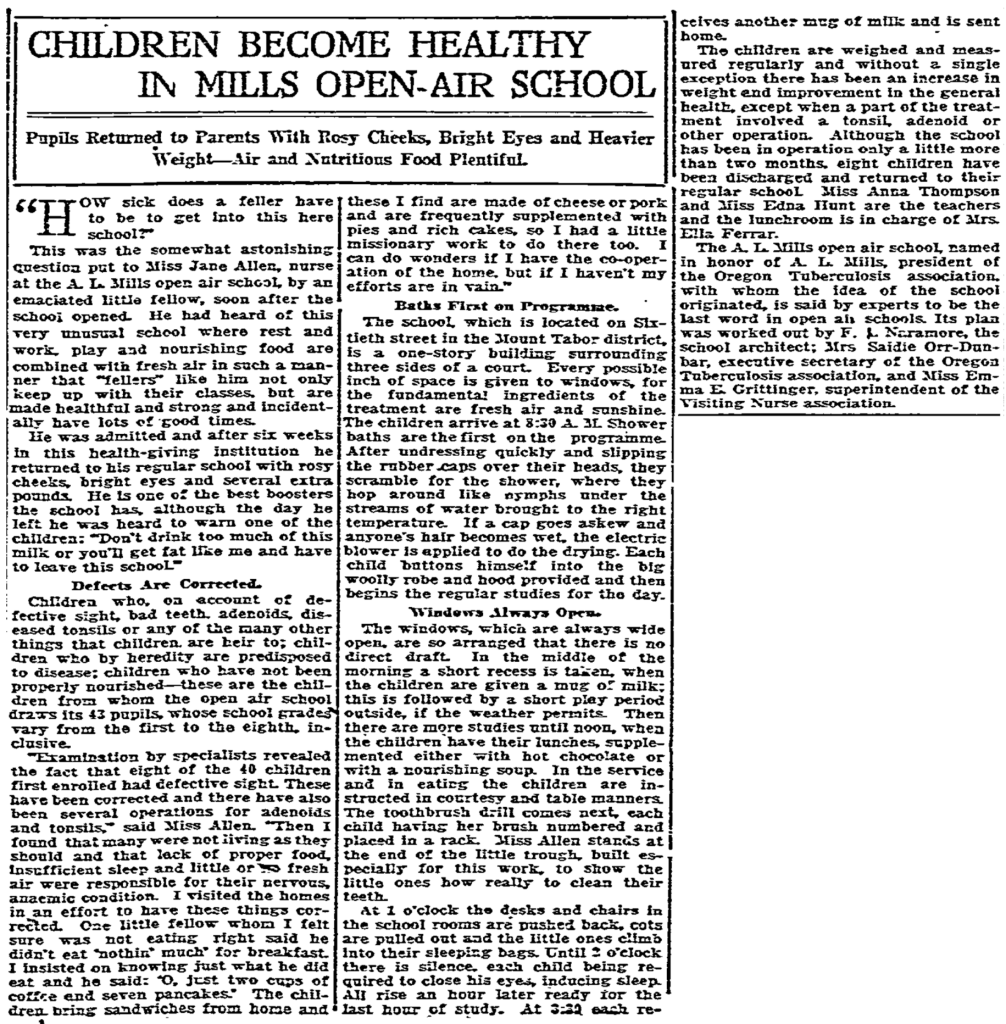 This month we’ve been working with the Portland Housing Bureau and the Mt. Tabor Neighborhood Association to research and to share the remarkable story of the A.L. Mills Open Air School located at the southwest corner of SE 60th and Stark.