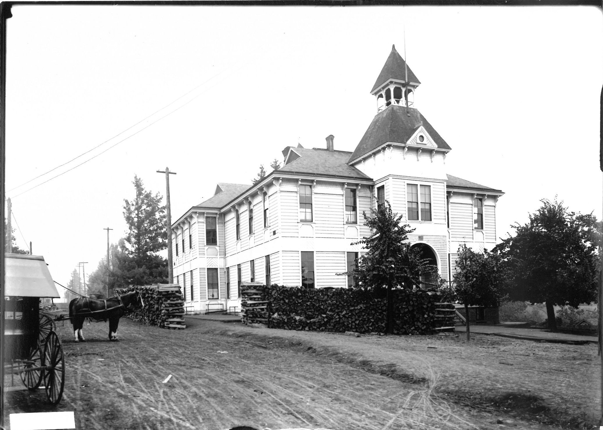 Looking south on 60th at the corner with Stark (then known as Baseline Road), about 1907, four years before this school burned, clearing the site that has hosted the Open Air School since 1918. Drying cordwood is stacked for the furnace in the old school. Courtesy of the Oregon Historical Society, image Org-Lot-982, Box 8 Folder 6.