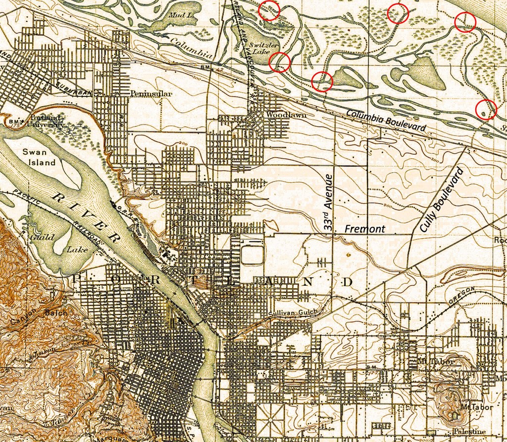 There are aerial photos too, some of which are available through City Archives, and others through the University of Oregon Library’s Aerial Photography Collection. Dating back to 1925, these images are mostly low resolution and grainy, but good enough to help address larger-scale mysteries. Examining the same place from the air every 5-10 years back to 1925 is fascinating and always humbling to see all we’ve missed and don’t know about a place.