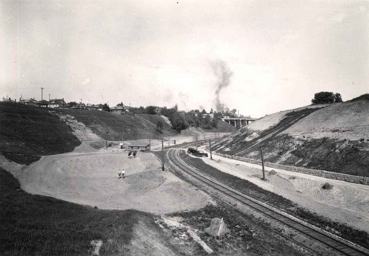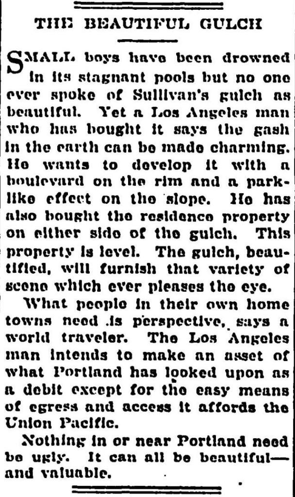 In 1907, following the Lewis and Clark Exposition and with home construction and residential land speculation fever running high, residents of the area began to lobby for a wider multi-use crossing of the gulch in this area. The trestle was replaced in 1909 by construction of a concrete viaduct.