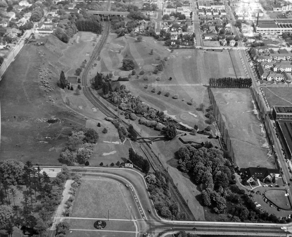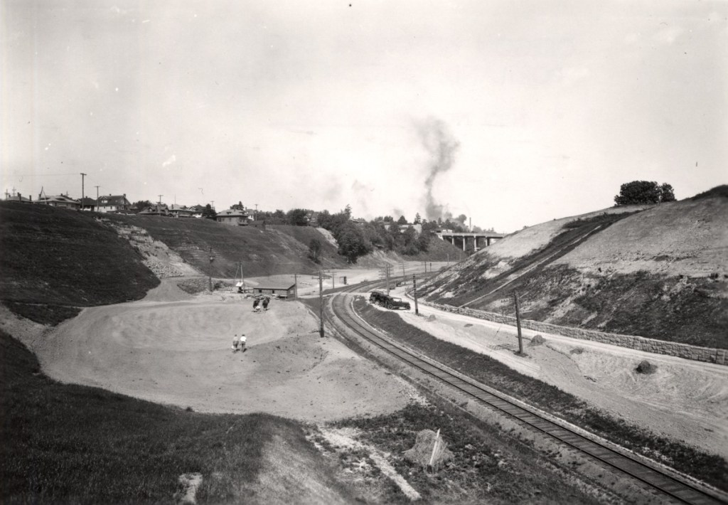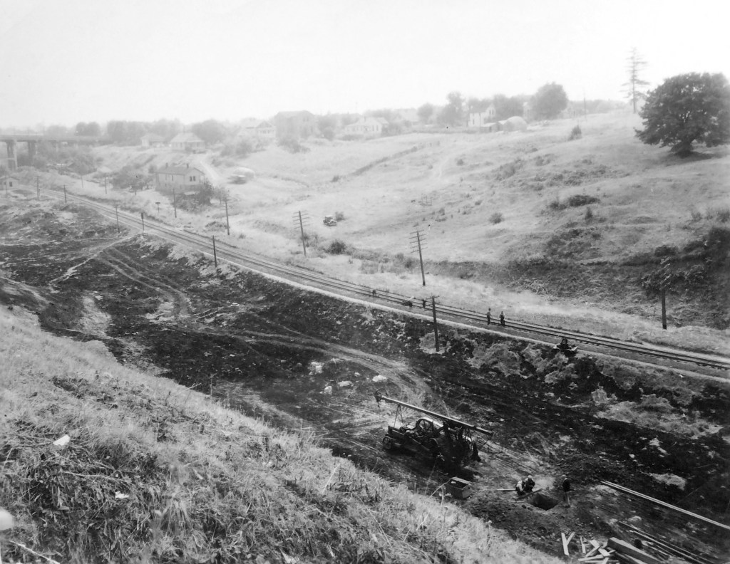 City & Suburban Railroad operated the East Ankeny Line, which terminated in the streetcar barns that once stood near NE 28th and Couch, about a mile due south. For the executives at Doernbecher, it was an obvious proposition to pay the railroad to extend its line north straight up 28th, build the trestle and two prominent stairways down, so workers could come and go conveniently. Meanwhile, City & Suburban was also eyeing service to the neighborhoods taking shape to the north of the gulch, and the possibility of a loop with the existing streetcar service that ran up Broadway into Irvington and later Alameda.