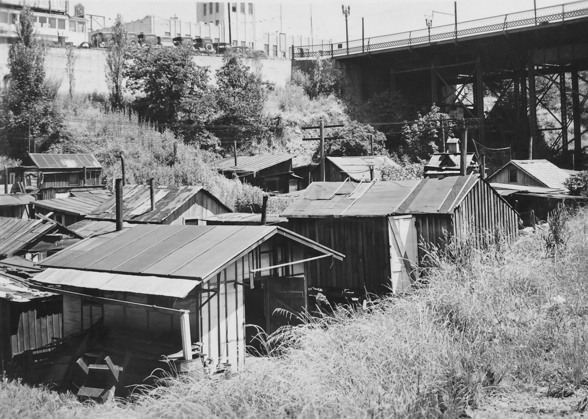 - The homes pictured at the edge of the gulch, several of which are still standing today along NE Wasco and Multnomah streets, provide a tell-tale indicator this view looks north.