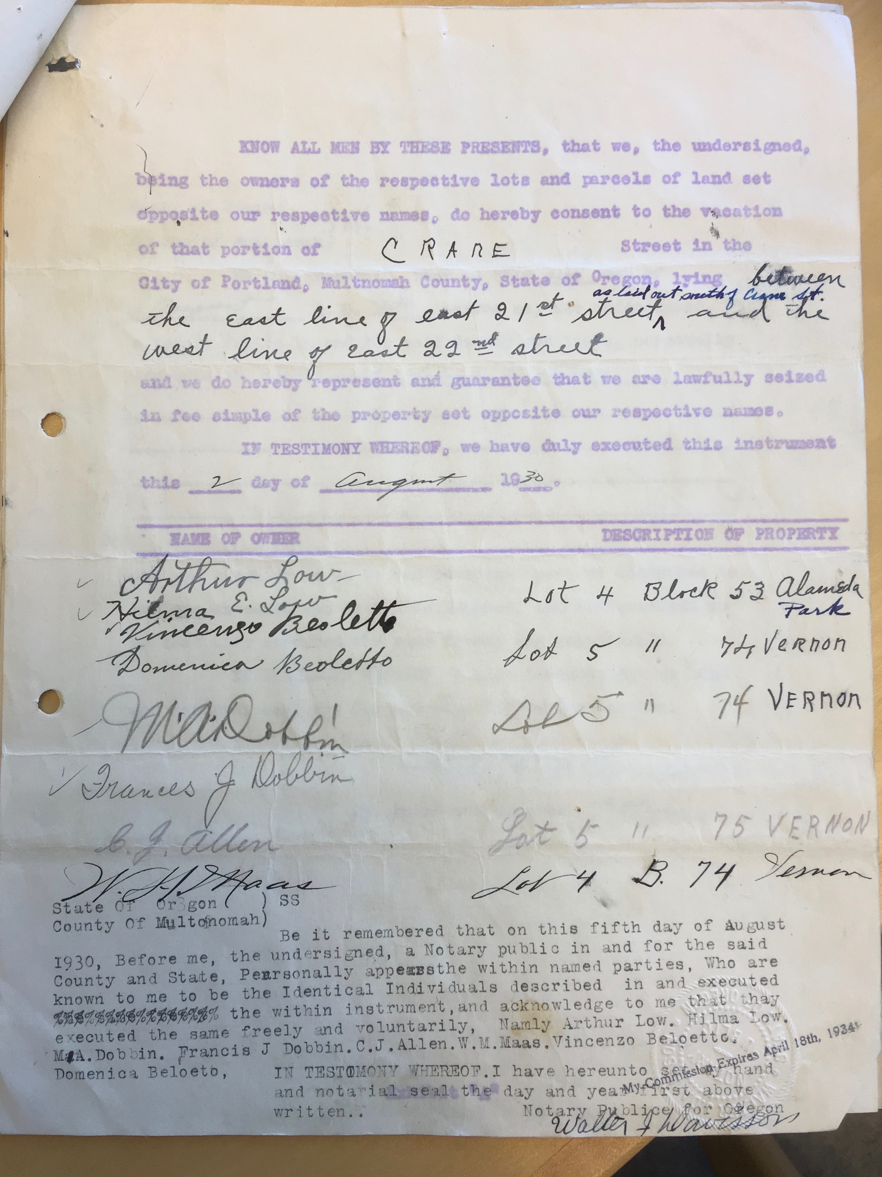 The Town of Creighton (like the Town of Wayne adjacent to Alameda) wasn’t actually a town, more like the idea of a town, hatched by property speculators in 1883, drawn out as a kind of map and filed with the Multnomah County surveyor. Remember back then this neck of the woods was well outside the city limits. The Town of Creighton plat is unrecognizable today: its tentatively drawn tree-related street names didn’t carry through time: Maple, Walnut, Beech, Locust, Birch. Creighton’s only legacy is the location of boundary lines on today’s map: north of Killingsworth, east of 25th, south of Rosa Parks and west of 33rd.