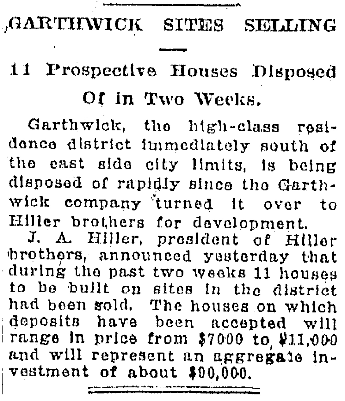 The company’s early niche was a mid-market bungalow-style house, with designs by Hubert A. Williams. Excellent examples of these can be found on both sides of NE Knott between NE 30th and NE 32nd, virtually all were built by Hiller Brothers. As the housing market matured, the Hillers chose to focus on building higher-end homes and developing entire new neighborhoods, including Garthwick in southeast Portland where the company was the lead developer.