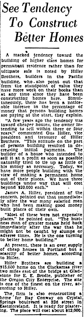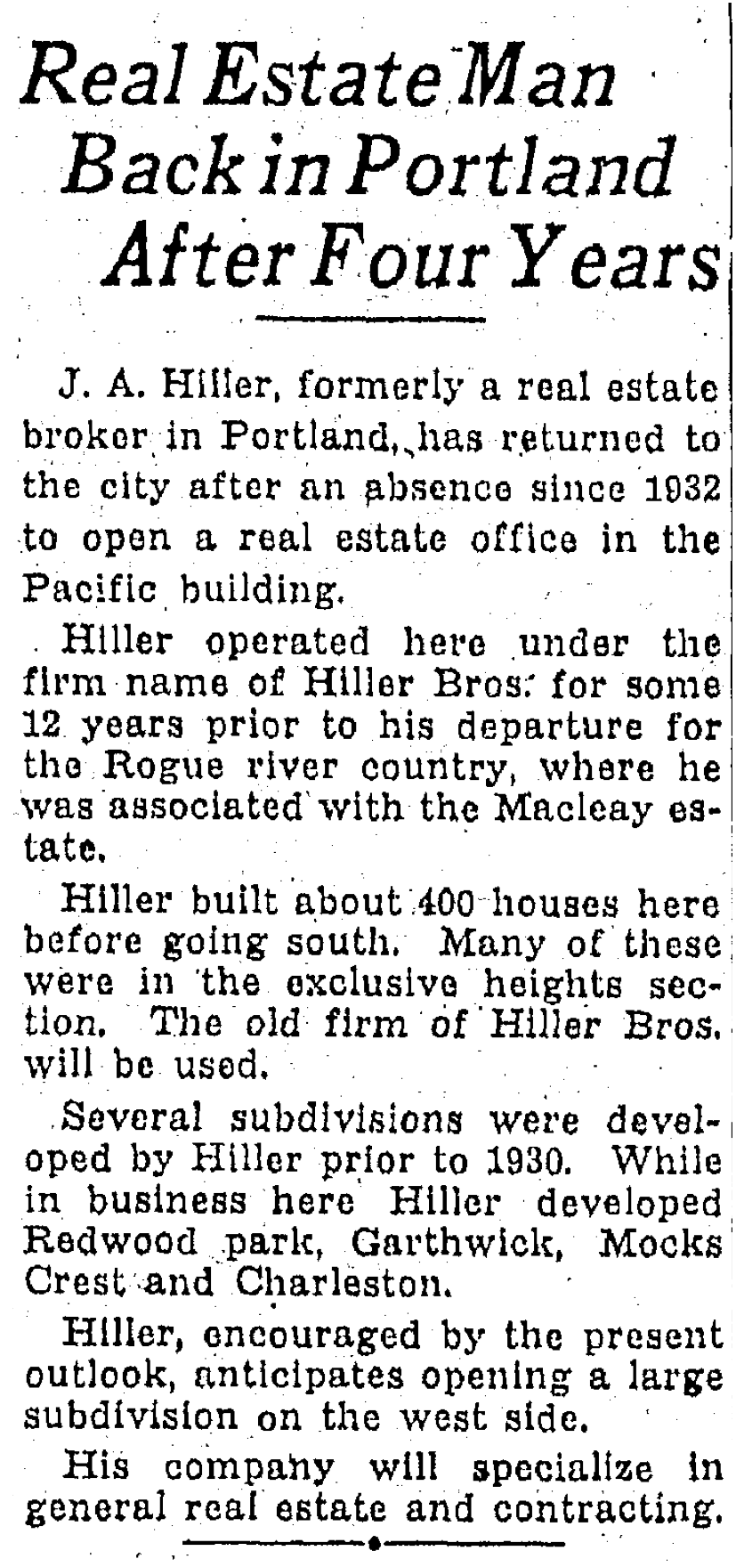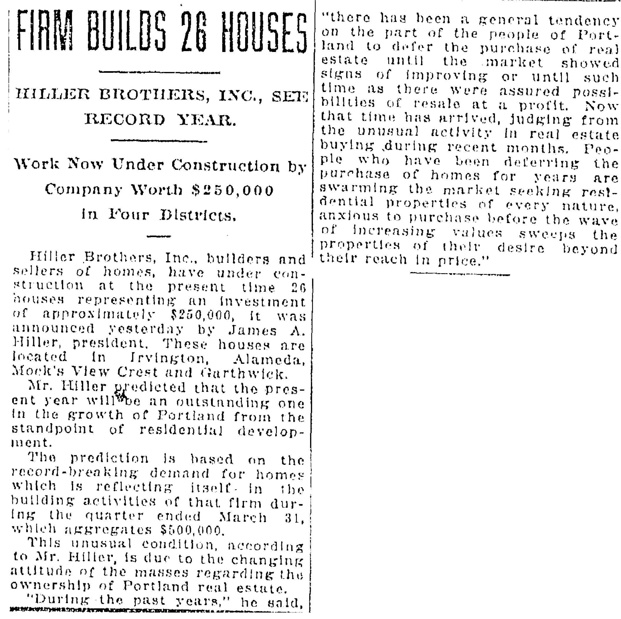 James Hiller reflected on real estate market trends and hinted at the future in a May 1926 interview in The Oregonian, and later in a September 1927 interview with the Oregon Journal.