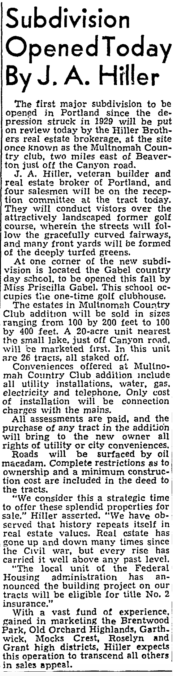 The westside development project was larger than anything attempted since the first residential building boom years after the turn of the century, and may have been what lured James back to the Portland area. In September 1936, James made an announcement about a well-established and bucolic West Slope landscape that was about to change dramatically: