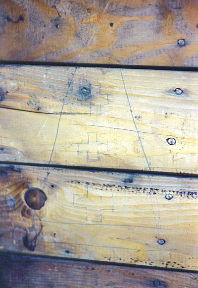 Our builder, William B. Donahue (or his mason), used some unusual brick patterns on his chimney exteriors (I’ve found four other Donahue houses in the neighborhood…more on that in a future post). On the outside face of the firebox he used brick to create crosses, patterns and other symbols. When we were replacing some cracked siding a few years back,  I found a series of sketches on the sheathing right next to the chimney that showed he was thinking about a cross.