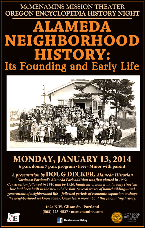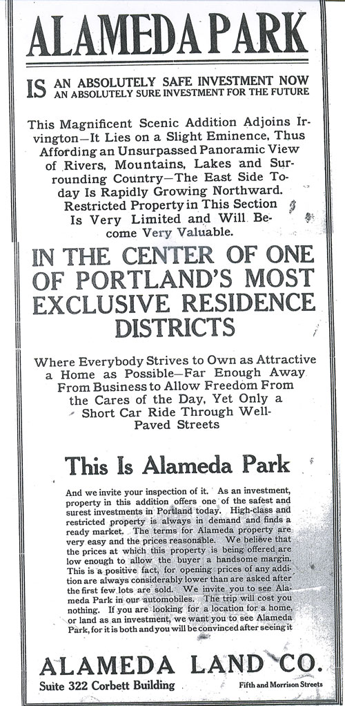 This ad tells us much more about the men behind the Alameda Land Company than it does about the development itself. You get a very clear idea of who they were pitching to, and their intent to offer a “first in” deal to the early wave of investors and potential homeowners. It’s important to point out that in March 1909, there wasn’t much up here on the ridge but mud, Douglas-fir trees, brush, some small orchards and a rutted dirt road running up the hill (today’s 33rd Avenue). Panoramic views of lakes? Hmm. Not sure where they got that one. There was a small pond in the area near today’s NE 28th and Siskiyou. Maybe you could see that from the ridge…