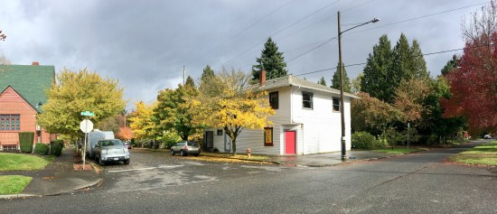 The old frame structure standing on the northeast corner today dates to 1923, a few years after the days of the big dance platform and the dogwoods. That time traveler of a building started out as Hinrich’s Grocery—one of the neighborhood’s many mom and pop stores—and once had large windows facing Ainsworth, which you can see in this photo from 1944 looking north of the Alberta Streetcar parked at that intersection.