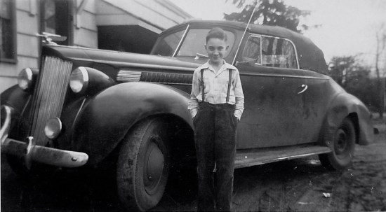 Here’s young Mike in about 1945 standing in front of his Uncle Joe’s pride and joy—a 1941 Packard convertible, parked in front of Cabin 6, behind the Spur Tavern.
