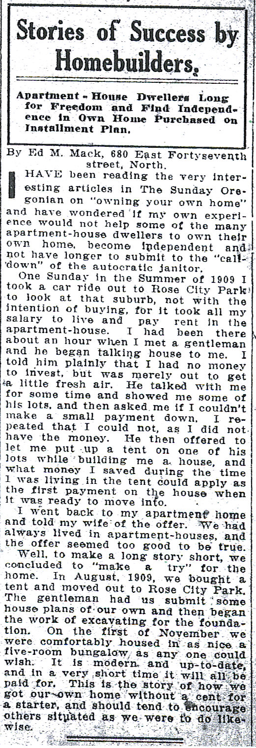 “Early in the year 1912, a number of successful Portland business men, confident of the wonderful future of the metropolis of the Pacific Northwest, organized The Oregon Home Builders for the purpose of purchasing, developing, sub-dividing and selling real estate in and around the city of Portland and to finance and build modern homes on its own tracts for sale on monthly payments like rent… to participate in the golden harvest to be reaped in Portland through its certain growth, prosperity and development within the next few years.”