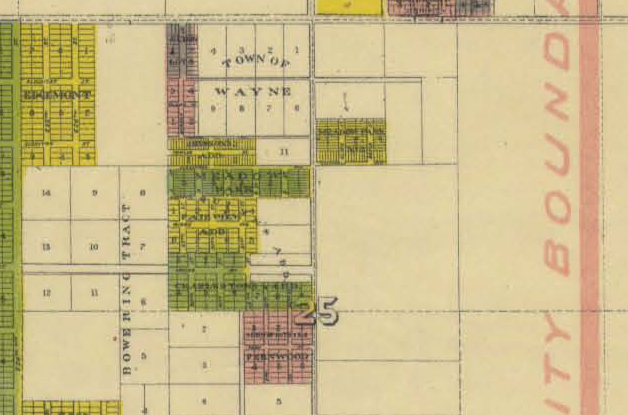 This detail from a much larger map shows the area of the Pearson farm in 1906. NE Fremont runs across the top of the frame. NE 33rd is the main road running vertically through the middle. NE 24th runs vertically on the far left side, along the edge of Edgemont. Look carefully and you can see Klickitat and Siskiyou streets. Note the Bowering Tract. The Pearson Farm is the empty lot east of Edgemont and west of the Town of Wayne. Note our proximity to the city limits: the pink vertical line on the far right shows the boundary. The large number “25” is section 25 in Township 1 North, Range 1 East of the Willamette Meridian. Click the map for a large image.