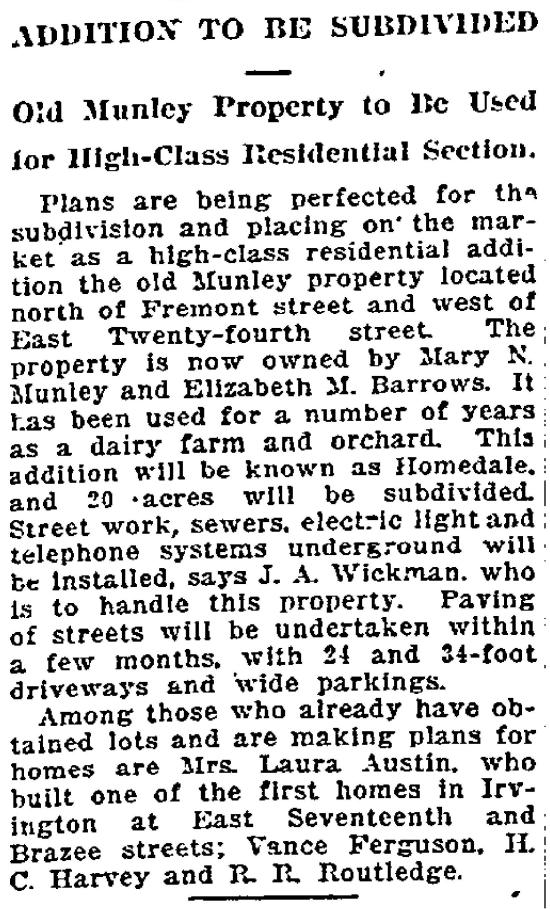 “Before 1921 and 1922 when city lots were staked out, much of this was an apple orchard, the remnants of which can still be seen in some back yards. The trees grew right down to the edge of the Fremont Street [side]walk and there were several old buildings on the place, residential and otherwise, including a large farmhouse painted light brown which was located close to Fremont in the vicinity of 21st Avenue. This house dated back to the 1890s or before and people lived there in apparent comfort in a rural setting, yet in the midst of modern houses that [were being built] in all directions.”