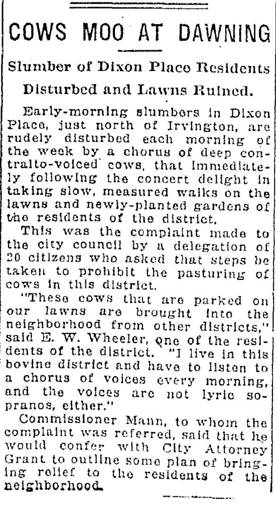 If you’ve read this far, you deserve the reward of one of our all-time favorite news stories from that time illustrating the consequence of this early day change of land use from agriculture to residential (a subject that bears exploration in future posts). Dixon Place is the next subdivision to the west just a few blocks over, between Fremont to Shaver and from NE 15th to NE 19th, part of today’s Sabin neighborhood. What a great headline: