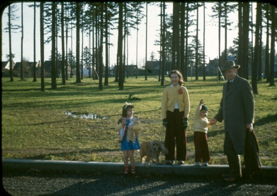 The Hamnett family on the north side of Wilshire Park, looking south, 1948. Note the gravel surface of NE Skidmore street. Photo courtesy of John Hamnett.