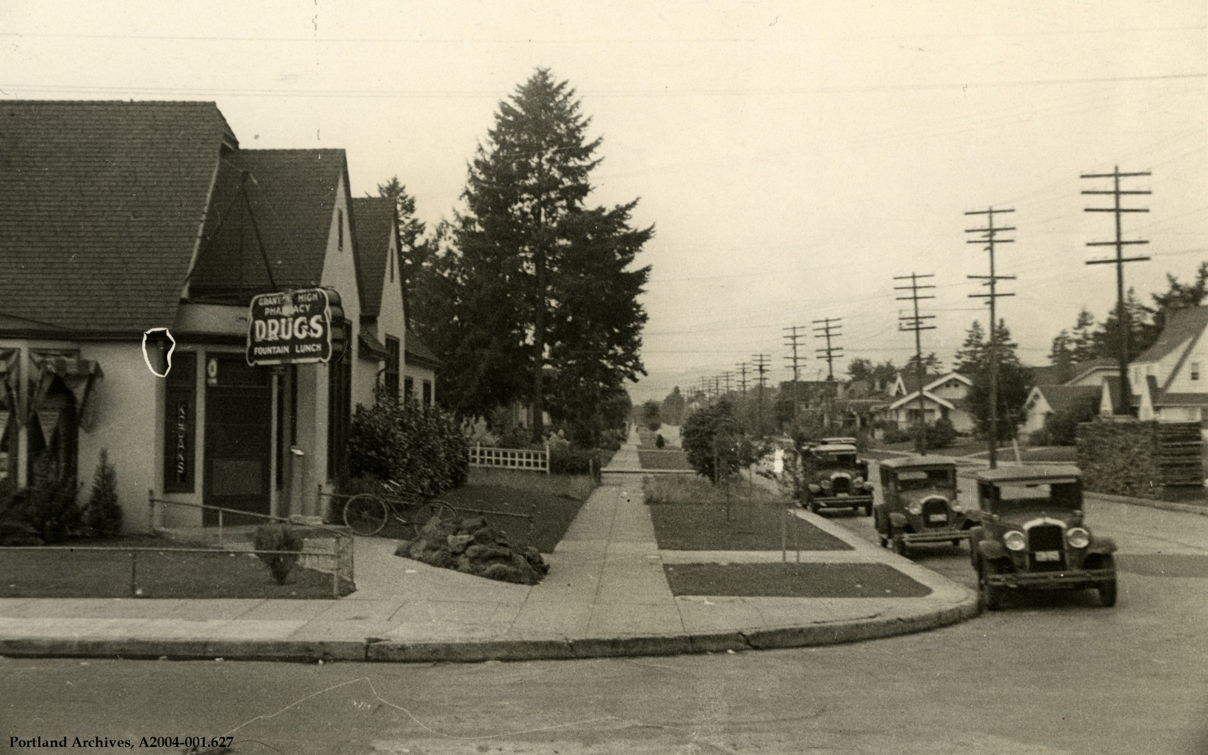 Grant Park Grocery and Market (shown at the top of this post) on the southwest corner of 33rd and Knott (2647 NE 33rd), built in 1925. This attractive grocery, now a medical office, had sleek-looking panel vans and a staff of white-aproned help who would deliver your phoned-in order to your door. Here’s a link to another photo taken on the same day, and some further information about the store.