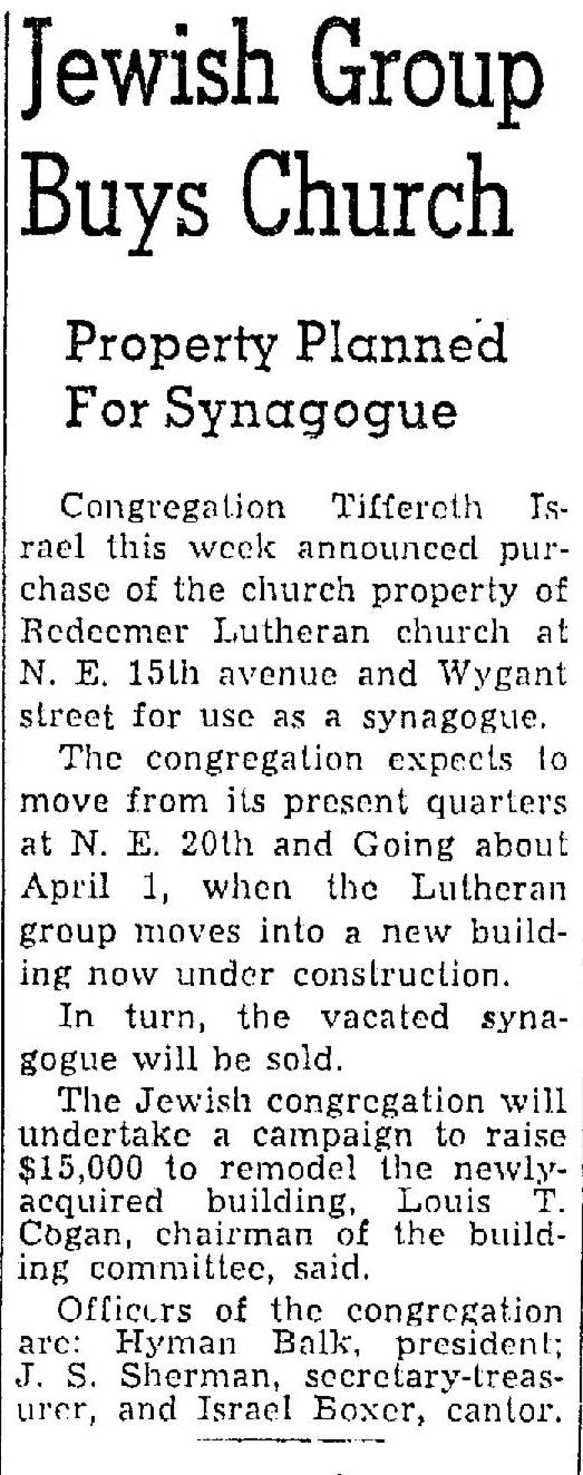 In December 1951, Tifereth Israel leaders announced they were going to buy the nearby Redeemer Lutheran building, and sell the Alberta Shul: