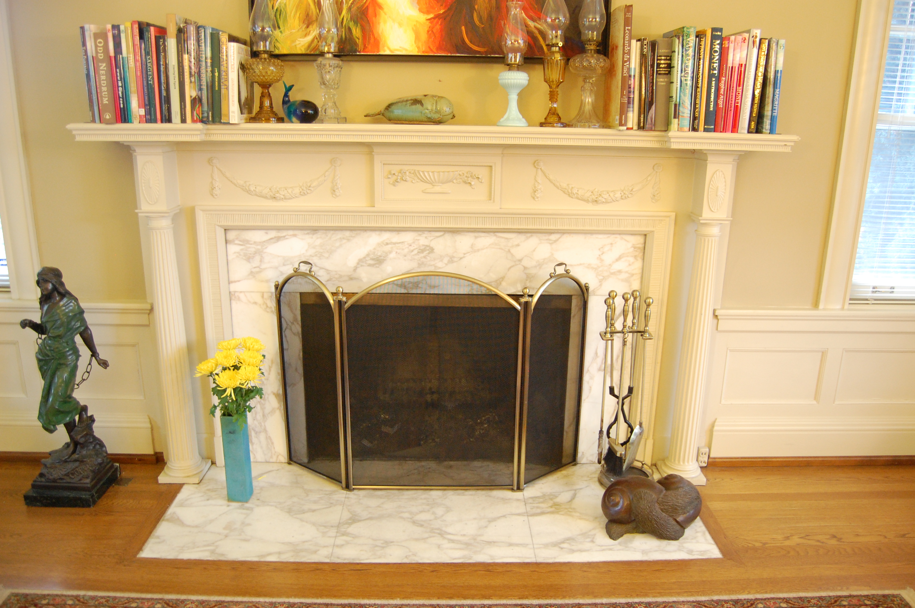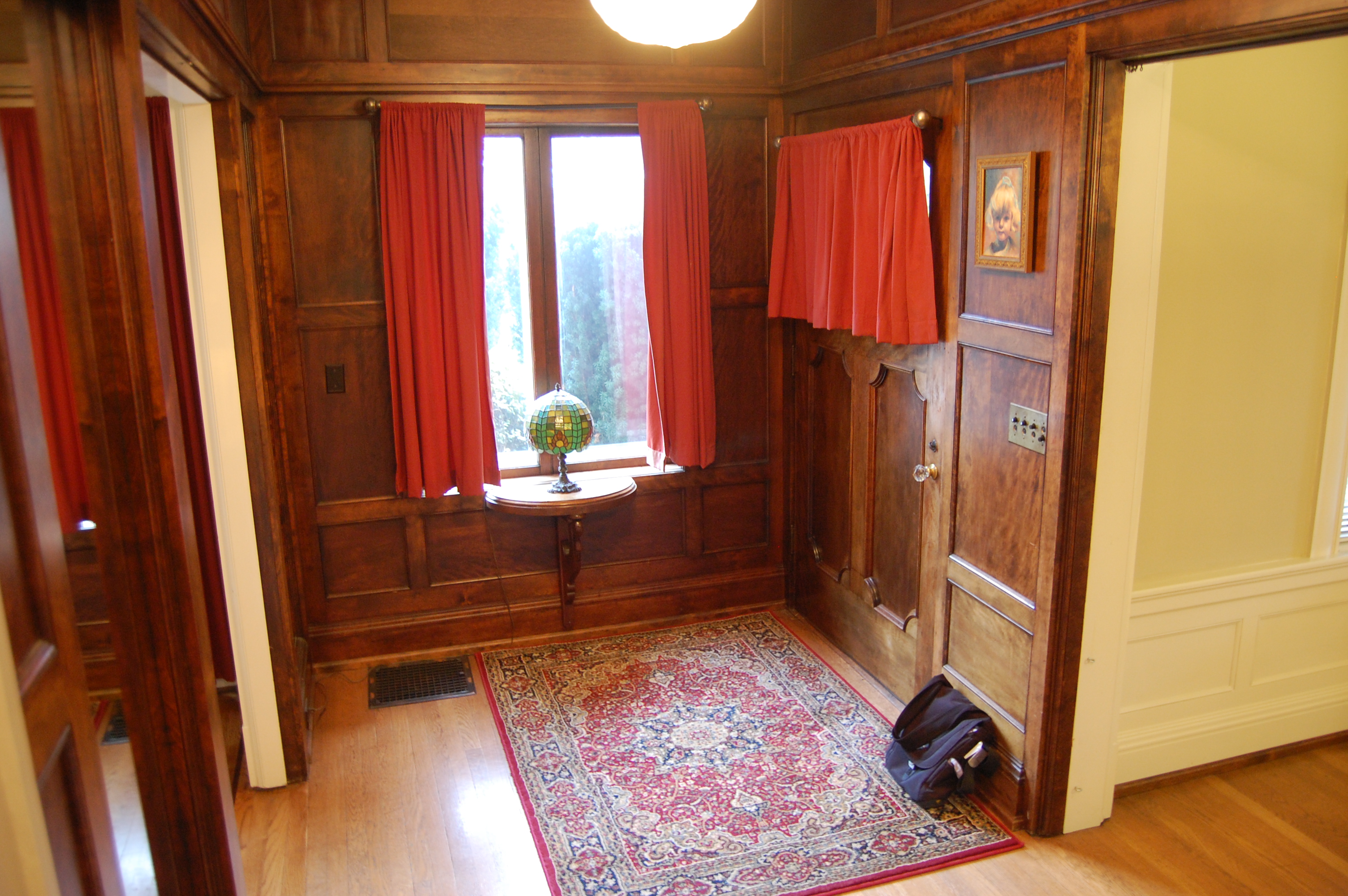 We visited the house recently and didn’t see any sign of the fountain room, though we did note the beautiful almost 3-D woven tile in the upstairs bathrooms; the marble fireplace (and a signature etched into the hearth); and the beautiful and stately birch paneled entryway. See the photos below by Emma Decker. The house is worthy of its national register status (Here is a link to the nomination form filed in 1985 Thomas Prince House HNR Nomination complete with floor-by-floor drawings and descriptions).
