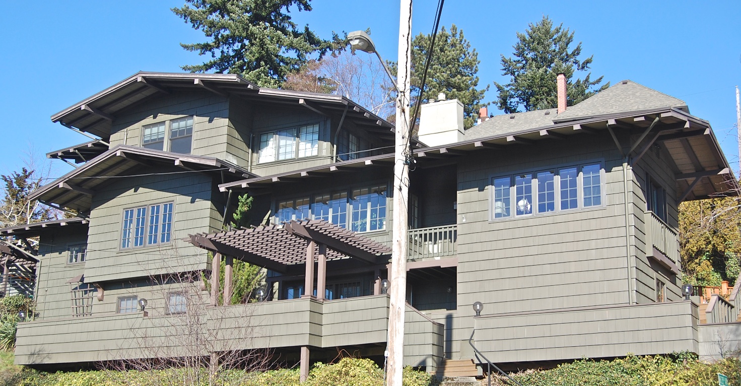 A careful look at then-and-now will reveal that the top floor open porch of the house has been enclosed; many windows have been replaced and a couple have been added; a new deck and walkway have been added along the lower level; trees have come and gone (but appear in similar locations); a power pole has been added in the foreground.