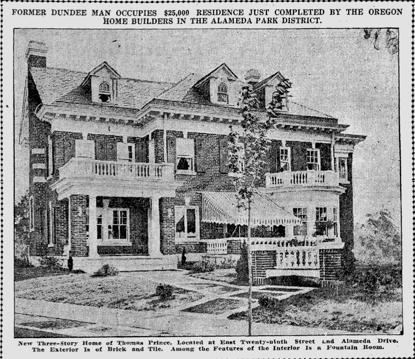Prince was an interesting person with at least two major careers behind him when at age 71 in 1912 he agreed to be the financial backer for Oliver K. Jeffrey and the Oregon Home Builders Inc. Jeffrey and his company built more than two dozen homes in Alameda and Olmsted Park—many of them unique, grand and built for wealthy clients—and as regular readers of the blog will recall, also built the building that now houses Gordon’s Fireplace Shop at NE 33rd and Broadway (check out the story if you haven’t read it. We know you’ve driven by this place and wondered what it’s all about). More soon about the Oregon Home Builders, a fascinating story that ends in a broken business model and bankruptcy.