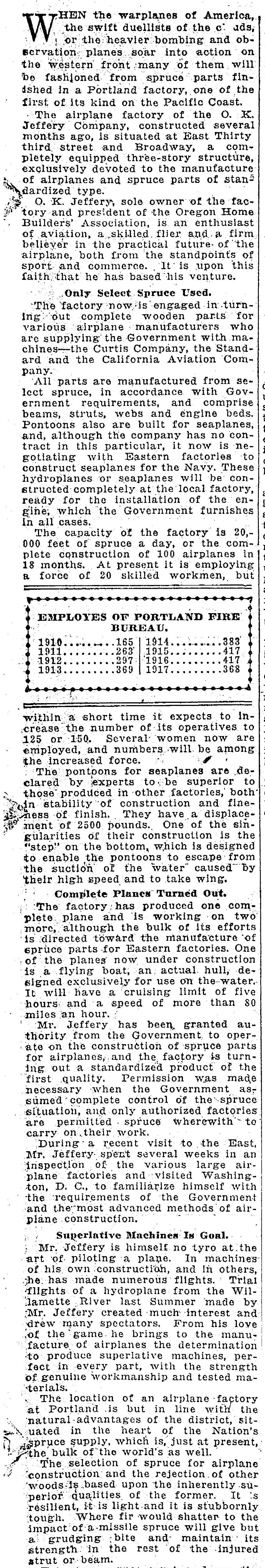 From The Oregonian, January 1, 1918. The table on Portland firefighters was a bonus thrown in by early editors jamming the New Years’ edition full of interesting facts. A similar story appeared in aviation and lumber related publications about this time, likely part of a PR campaign carried out by O.K. Jeffery.
