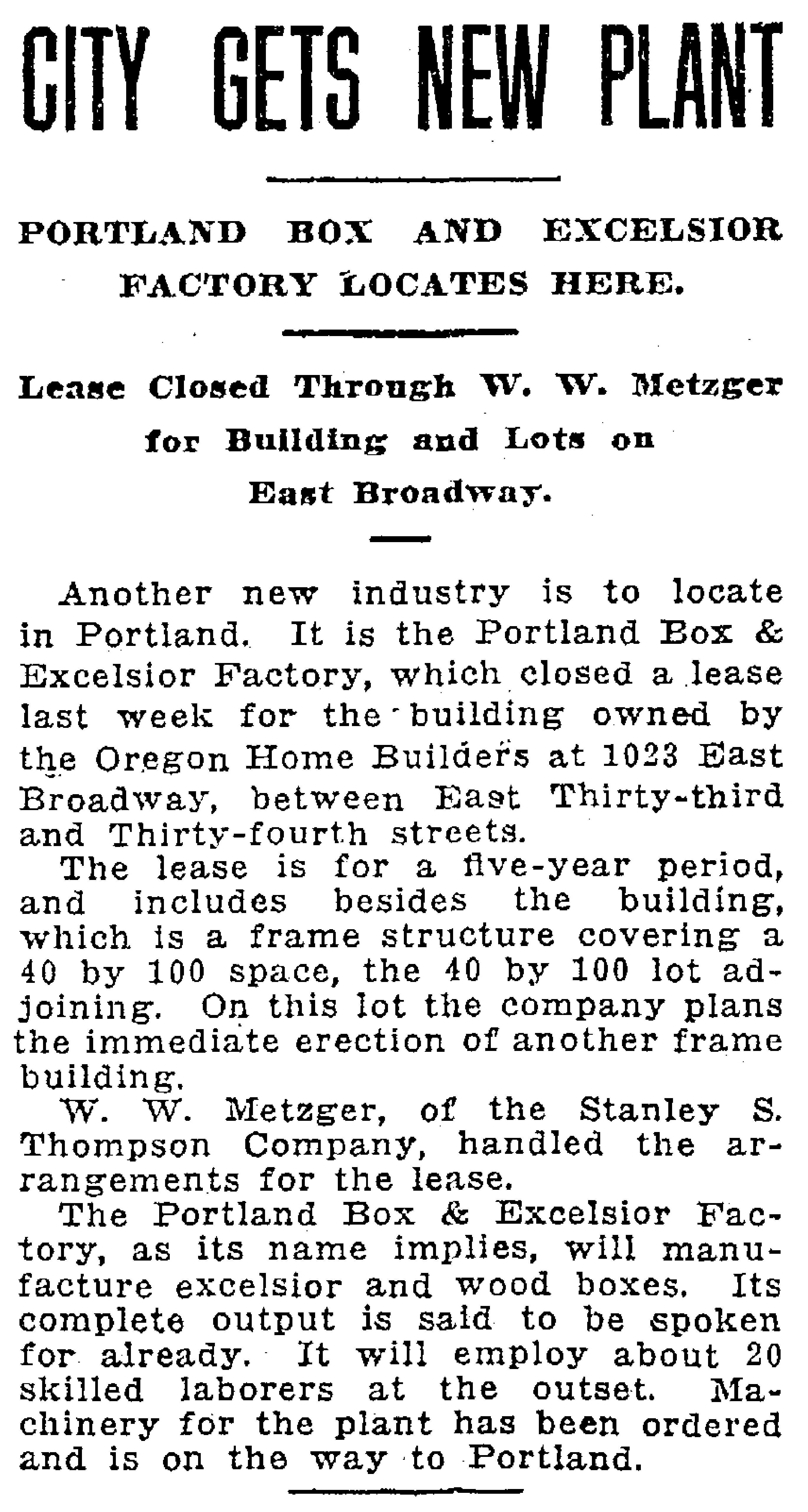 Hold on a second…the reality of what was actually going on with that building is evident in a news story from January 20, 1918 explaining the building, which had been vacant after O.K. Jeffrey’s airplane factory folded–apparently in late 1917–had been sold to Portland Box and Excelsior and was well on its way into a new manufacturing realm. Check it out: