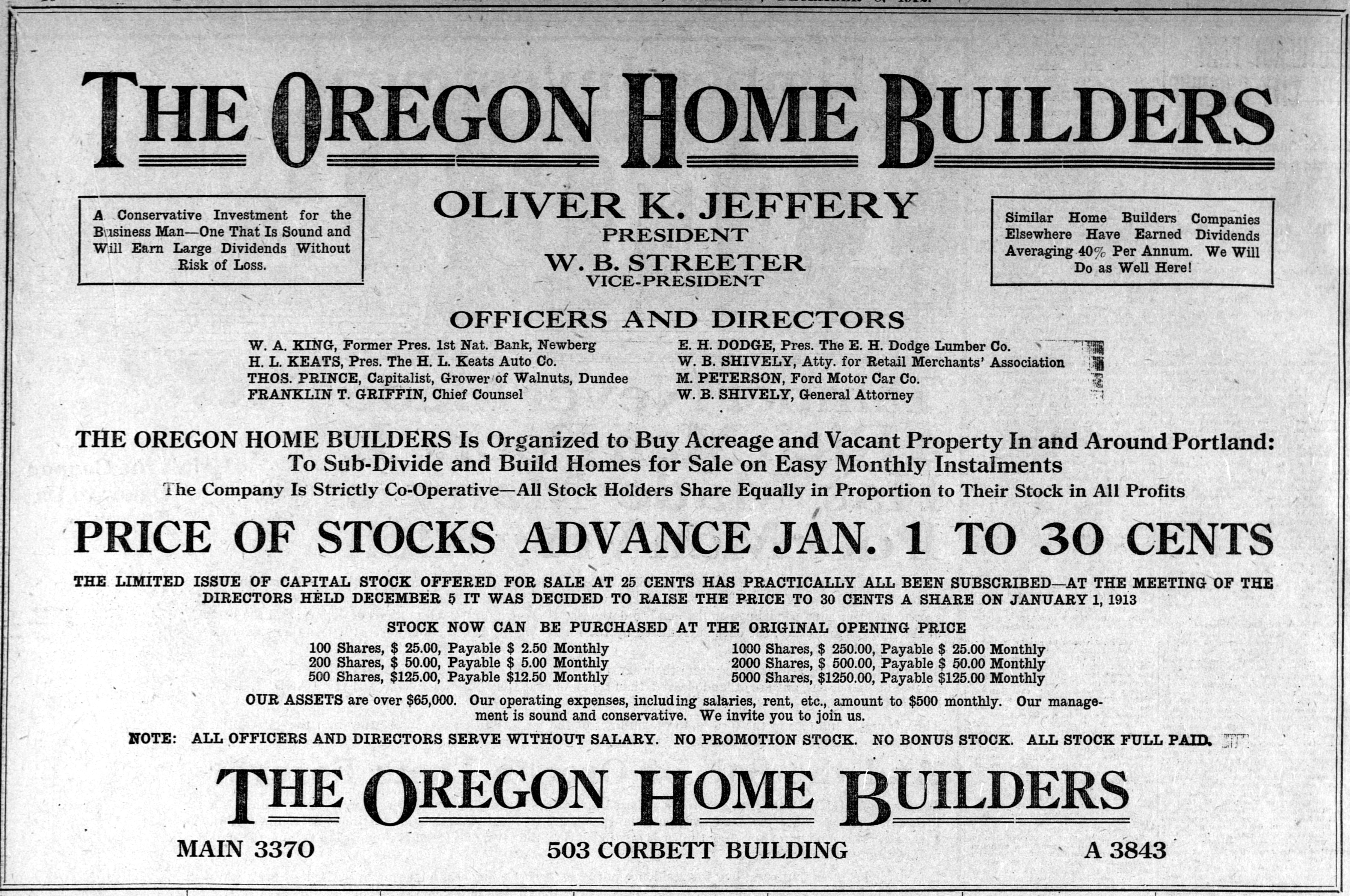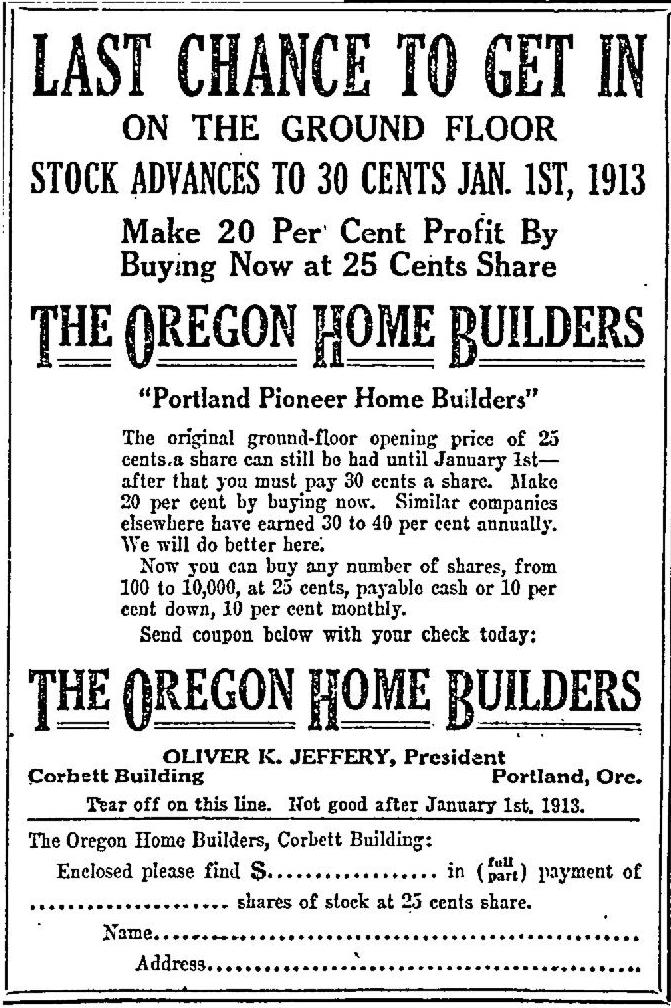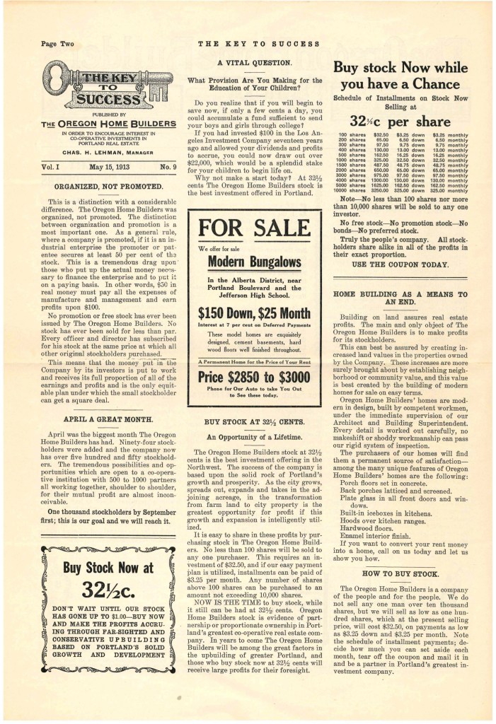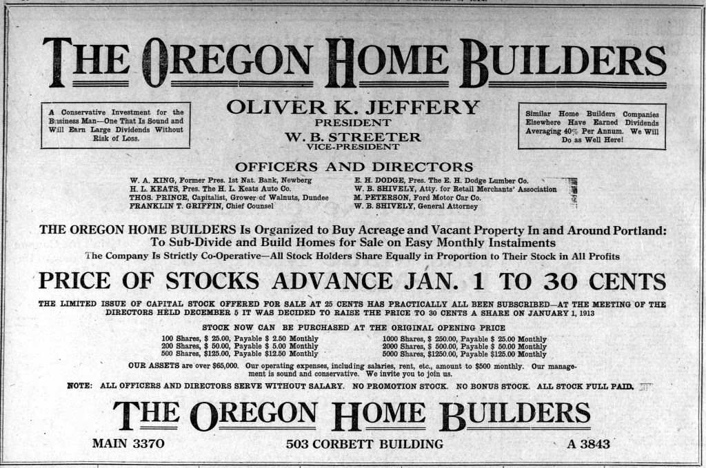 OHB was prolific in its advertising and marketing—and selling of what became worthless stock. Hundreds of advertisements in The Oregonian and The Daily Oregon Journal during its five-year run were as focused on selling stock in the company as they were on selling the real estate and houses it was developing.