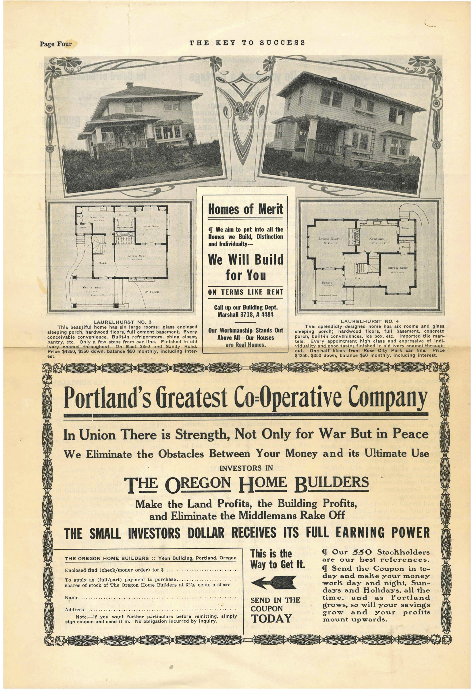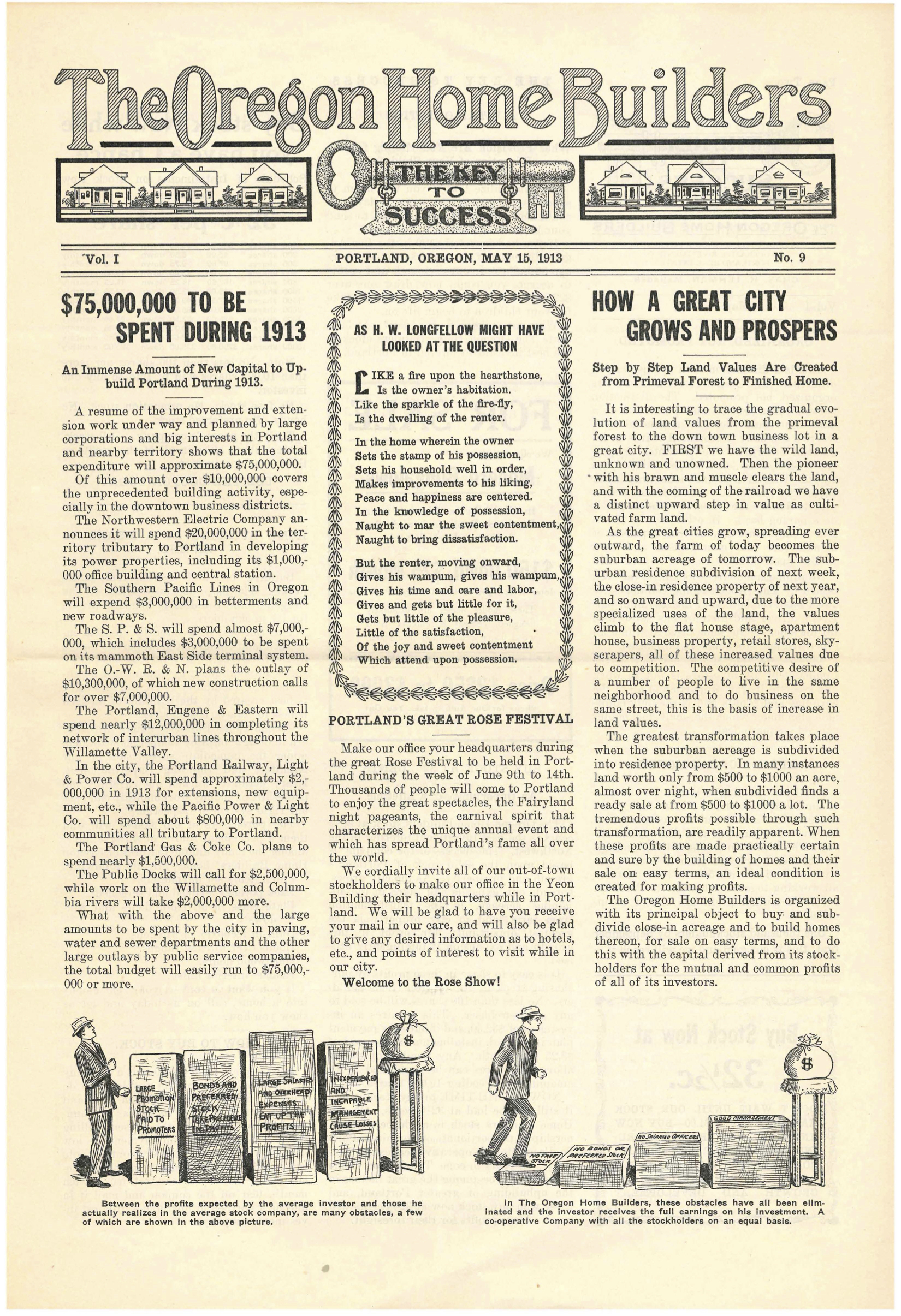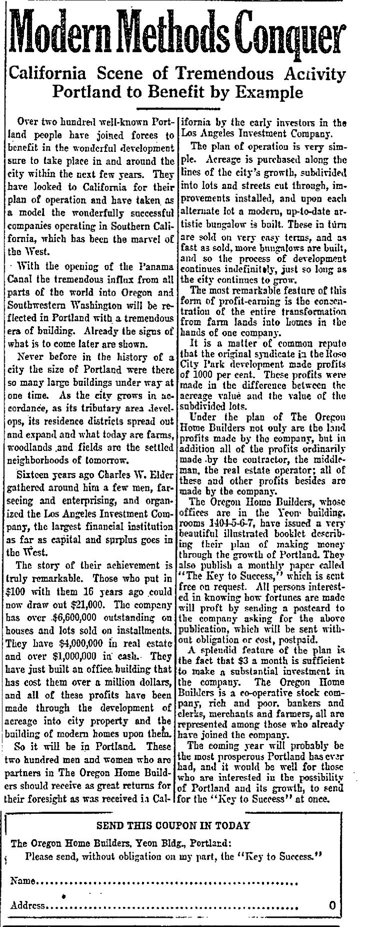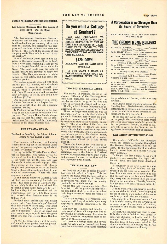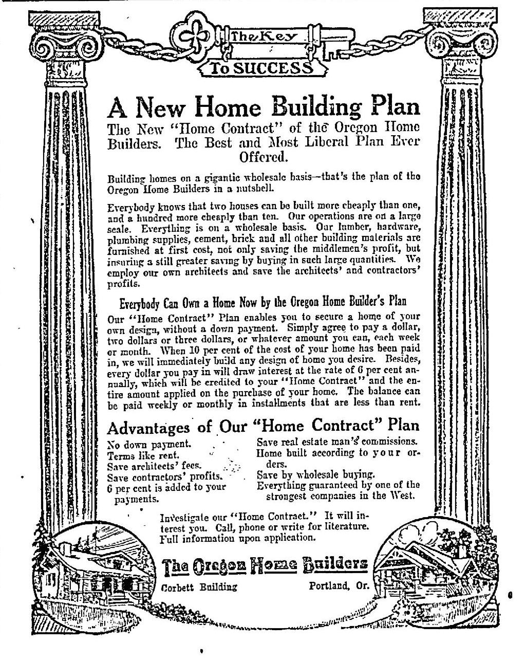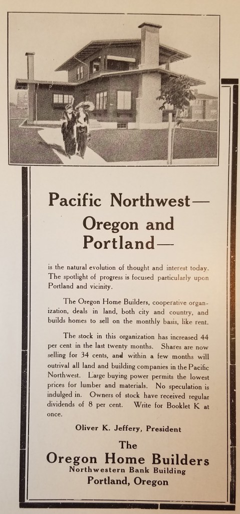 “Early in the year 1912, a number of successful Portland business men, confident of the wonderful future of the metropolis of the Pacific Northwest, organized The Oregon Home Builders for the purpose of purchasing, developing, sub-dividing and selling real estate in and around the city of Portland and to finance and build modern homes on its own tracts for sale on monthly payments like rent… to participate in the golden harvest to be reaped in Portland through its certain growth, prosperity and development within the next few years.”
