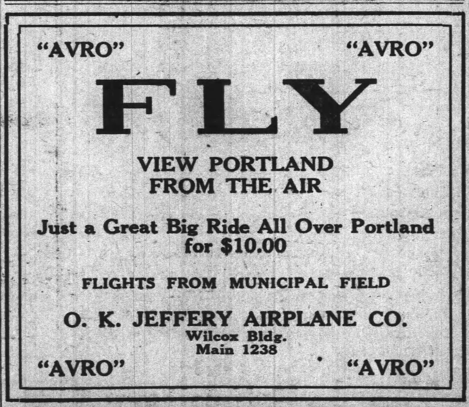 Somehow, after bankrupting the company and leaving stockholders in the lurch in 1917, and then closing down  his airplane factory after its very brief life, Jeffery was able to stay active and visible in Portland’s business and social scene, attracting heavyweight local investors to his aviation ideas. In 1920 he launched the Oregon, Washington, Idaho Airplane Company with an eye to establishing regional scheduled passenger flights, long before aircraft could actually carry many passengers. The business didn’t take hold, and Jeffery survived that ending too and went on to become a local distributor for airplanes built by Curtis and Avro. And a pilot. We guess he may have been happiest just flying people around. Here’s an ad for his business. Just a great big ride. Maybe that’s who he was in a nutshell.