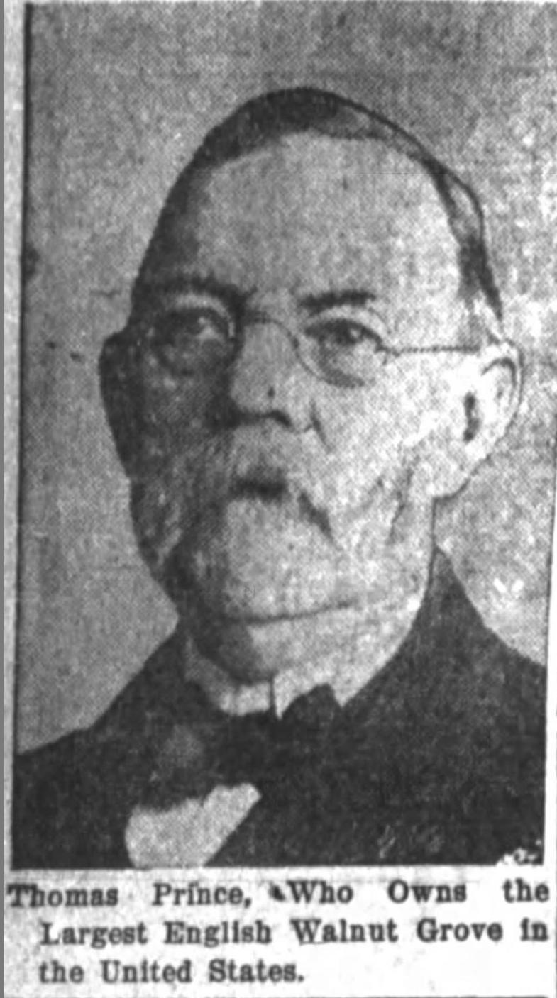 Prince’s roots were in Massachusetts, where he was a founding partner in Reed and Prince, a manufacturer of nuts and bolts with national market share (still in operation today). Something happened in the Prince family in the 1890s, and Thomas, accompanied only by his developmentally disabled son Harold Thomas Prince, left on their own for Oregon, where the elder became a walnut and fruit grower near Dundee. When he died in February 1920 at age 79, Prince owned and operated the largest walnut orchard in Oregon.