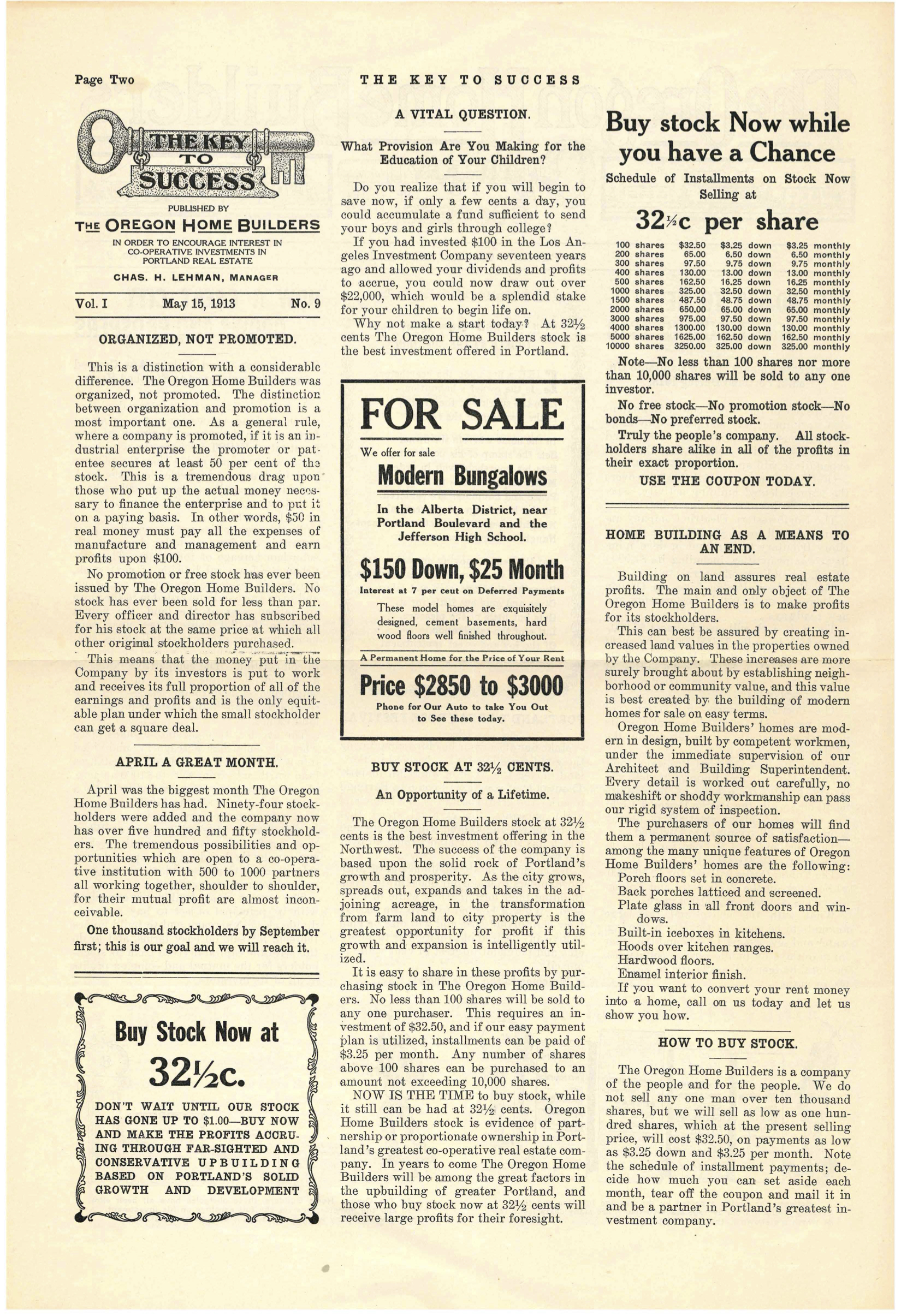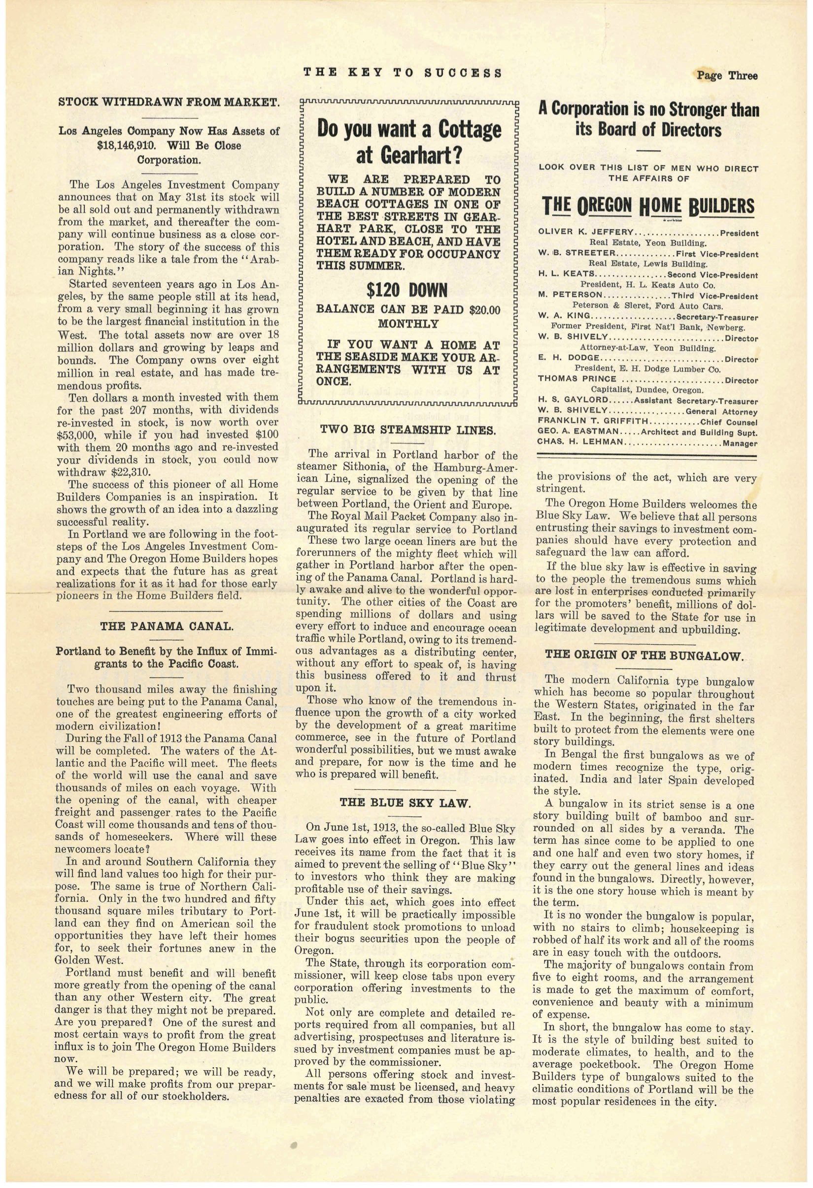 As OHB matured in its short five-year lifespan, the company added employees and different business lines, mimicking its California role model. Ads listed the company’s busy organizational structure: “Architecture Department, Construction Department, Real Estate Department, Land Sales Department, Rental Department, Repair Department, Loan Department, Financial Department, Insurance Department.” They even produced a monthly newsletter called “Keys to Success” which was sent to all stockholders. In one flashy newspaper advertisement, Jeffery boasted that OHB was the largest and best homebuilder in the Portland area. Discreetly placed classified ads sought additional salesmen:
