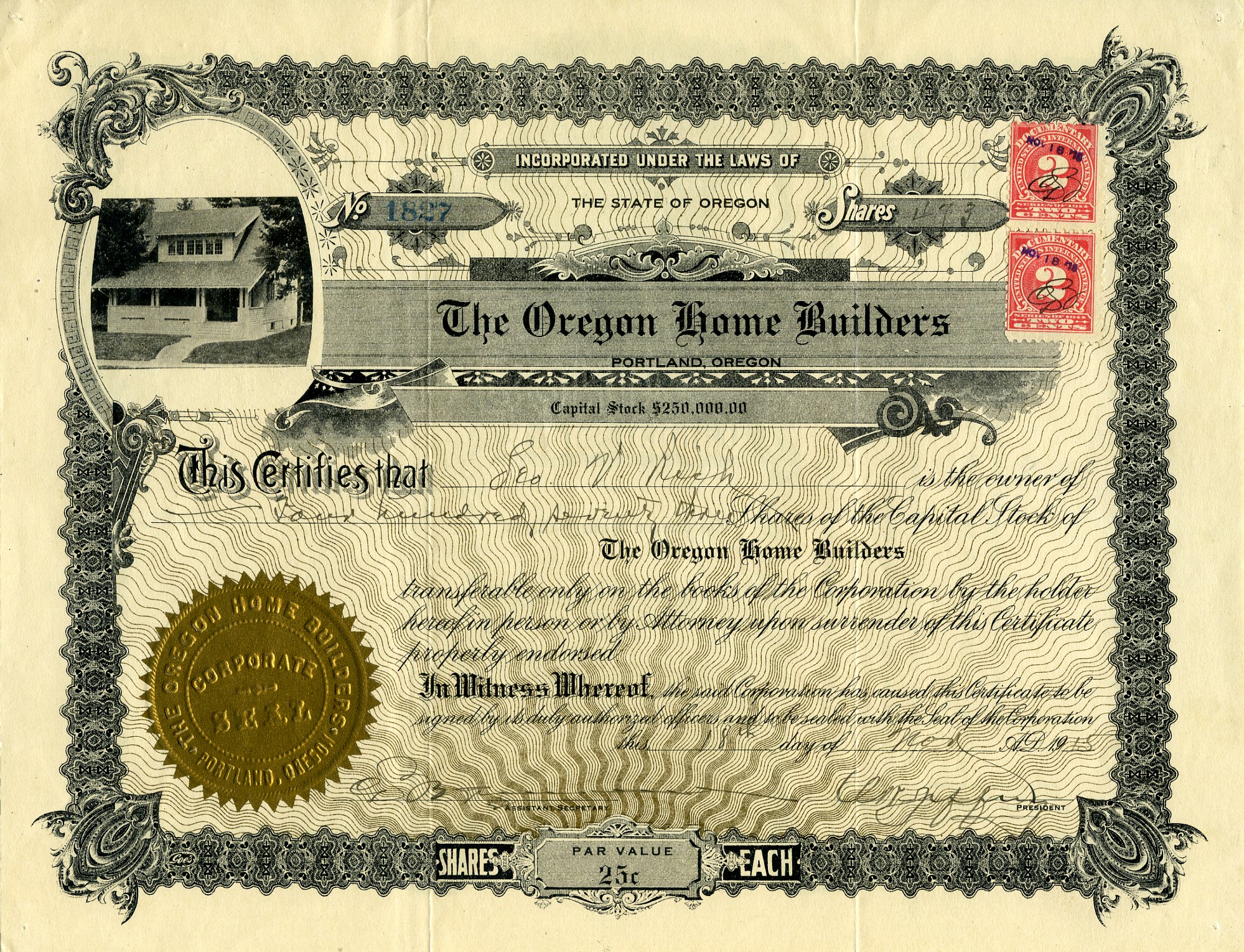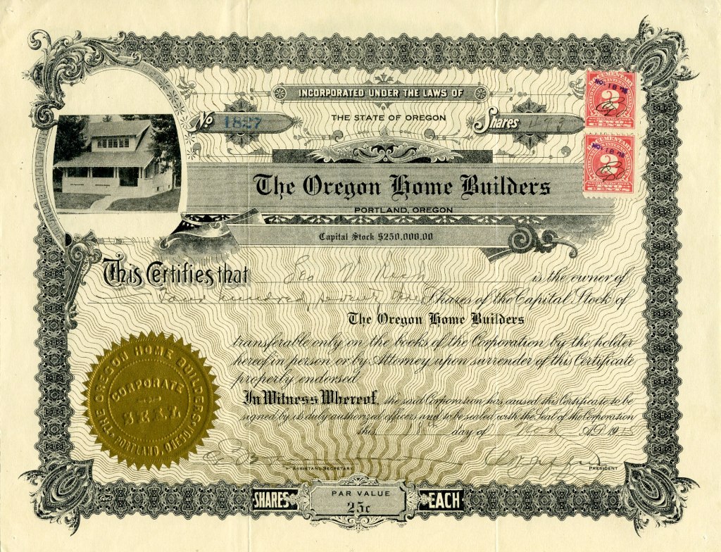 1915 stock certificate from Oregon Home Builders. Courtesy of Steve Rippon Collection.