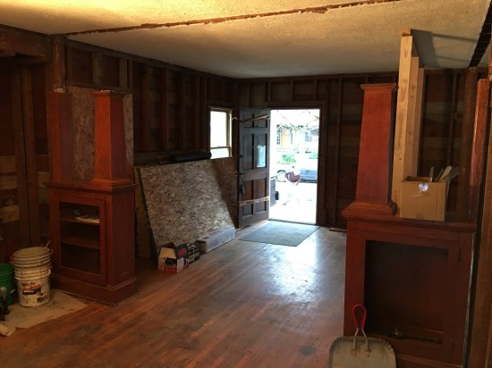 From the dining room looking into the living room. A portal wall framed the opening between the two rooms and came down to meet the columns that are atop the built-in cabinets. Behind the sheets of pressboard material on the left is a fireplace. Just like the historic Argyle plans. March 2, 2020.