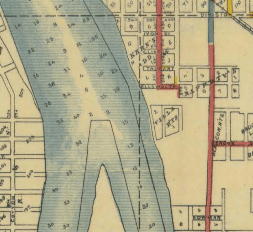 Bundy’s Bath’s appears to have been a collection of simple buildings for dressing, an enclosed area for swimming, a snack bar, and a set of diving platforms on the east bank of the river at what was the foot of Ellsworth Street. Here’s a map that puts this in context, and remember this is before the Ross Island Bridge, which came along in 1926. In 1910, Ellsworth Street was renamed Woodward Street.