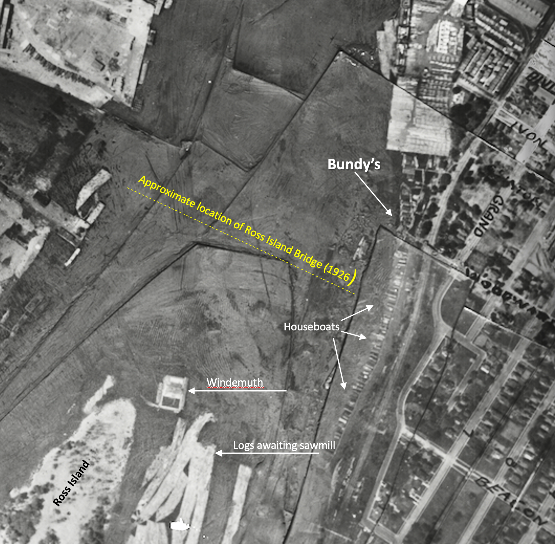 The vicinity of Bundy’s at the foot of Ellsworth Street was a kind of jumping off place into this watery world: if you were out on the river in this area to have fun (or to live in one of the houseboats) you passed through here. A careful look at aerial photos from the 1920s and 1930s shows a solid line of houseboats from Bundy’s south along the east bank of the river well into the bend across from Ross Island, and even lining the eastern shore of Ross Island.