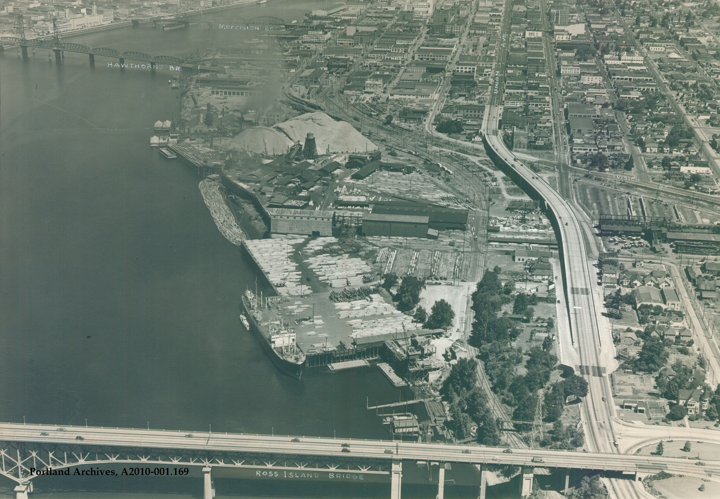 Furthermore, because so much has changed there in the last 100 years (including construction of the bridge), we’ve figured Bundy’s was extinct both as a place and as a name. We were pleasantly surprised this week, following the Windemuth post, to hear from a reader with a question about “Bundys Landing,” referring to the area’s later industrial years as a log and lumber loading zone for the nearby Inman-Poulsen mill, and after that a processing site for Ross Island Sand and Gravel. Maybe others have heard someone talk about Bundy’s, though it has certainly disappeared from any living memory.