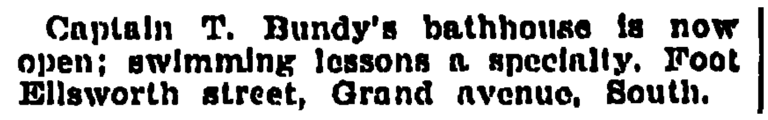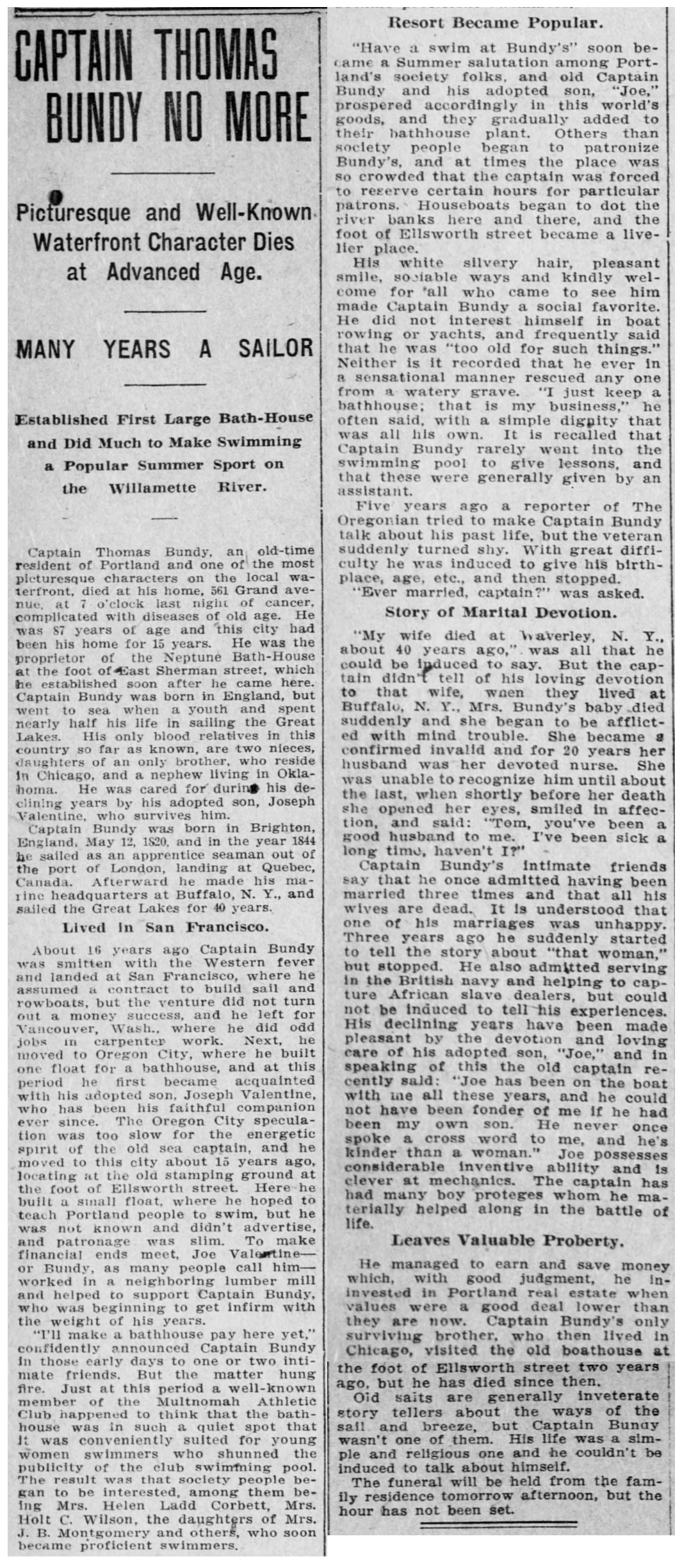 His obituary from January 20, 1908 describes Bundy’s interesting life, and credits him as being a leading advocate for swimming in the Willamette River: