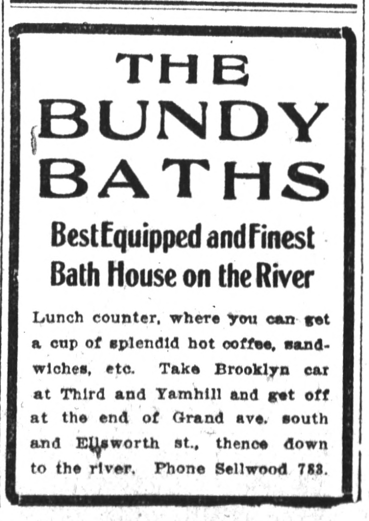 Reporting in the local papers from the early 1900s referred to a swimming venue in this area called Bundy’s Baths and the name quickly became applied in a shorthand way to signify the general vicinity we think of today on the east side of the river just north of today’s Ross Island Bridge. Over the years, we’ve bumped into passing references to Bundy’s: for instance, George Asa Eastman, the lead architect for Oregon Home Builders, had a houseboat / secondary residence in this area in the early 1900s.