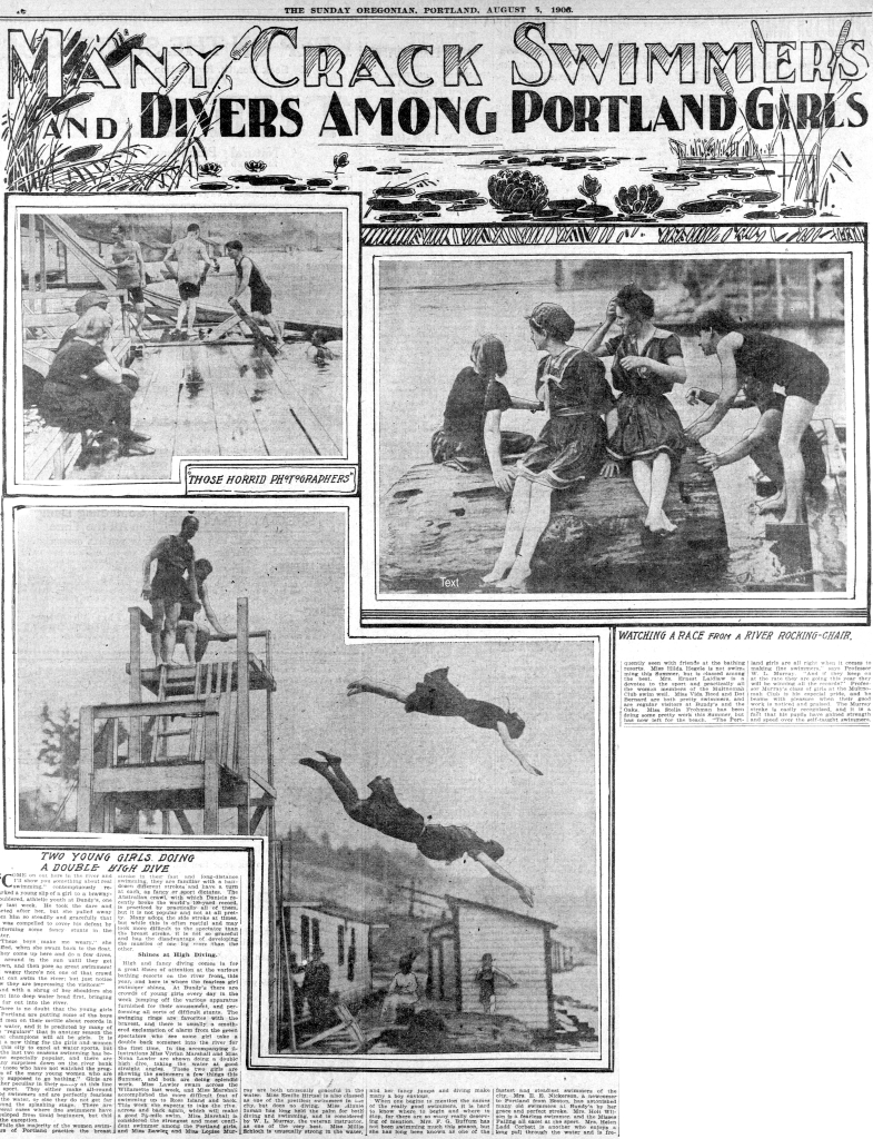Members of the Multnomah Athletic Club began frequenting Bundy’s resort—which was also known as the Neptune Baths—and soon it became the place to go, particularly for girls and women. Swimming and diving competitions took place here and eventually the Portland Yacht Club relocated just downstream to be nearby. It was the center of gravity for river swimming in Portland. We know it was busy: The Oregonian reported Bundy’s rented out 1,300 swimming suits per day in August 1915 and that more than 40,000 people used the foot of Ellsworth Street each year in the 19-teens for landing and embarking on the river. News coverage was abundant.