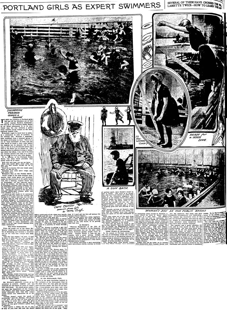 Click to enlarge: From The Oregonian, August 5, 1906. Note the buildings and shoreline at Bundy’s in the diving photo above. Below, from The Oregonian on August 9, 1903(note the sketch of Captain Bundy presiding).
