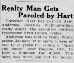 Anderson was convicted on April 27, 1918 and sentenced for 5-15 years for Grand Larceny, a charge that he appealed. His case was heard on appeal by the Washington State Supreme Court (Case 15146) on December 2, 1919 and was turned down. The next month, he appeared at the Washington State Penitentiary at Walla Walla to serve his term, which began on January 19th. After only one week—on January 27th, 1920—Washington Governor Louis F. Hart paroled him without explanation: