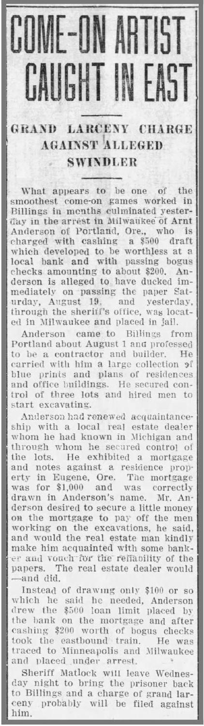 While awaiting trial in district court in Seattle, Anderson jumped bail and traveled through Montana, Minnesota and then back to Wisconsin working other con jobs along the way. He was arrested in Milwaukee, Wisconsin on August 19, 1916 and returned to Billings to be tried for a similar con he made there. The August 29, 1916 Billings Gazette detailed how it worked: