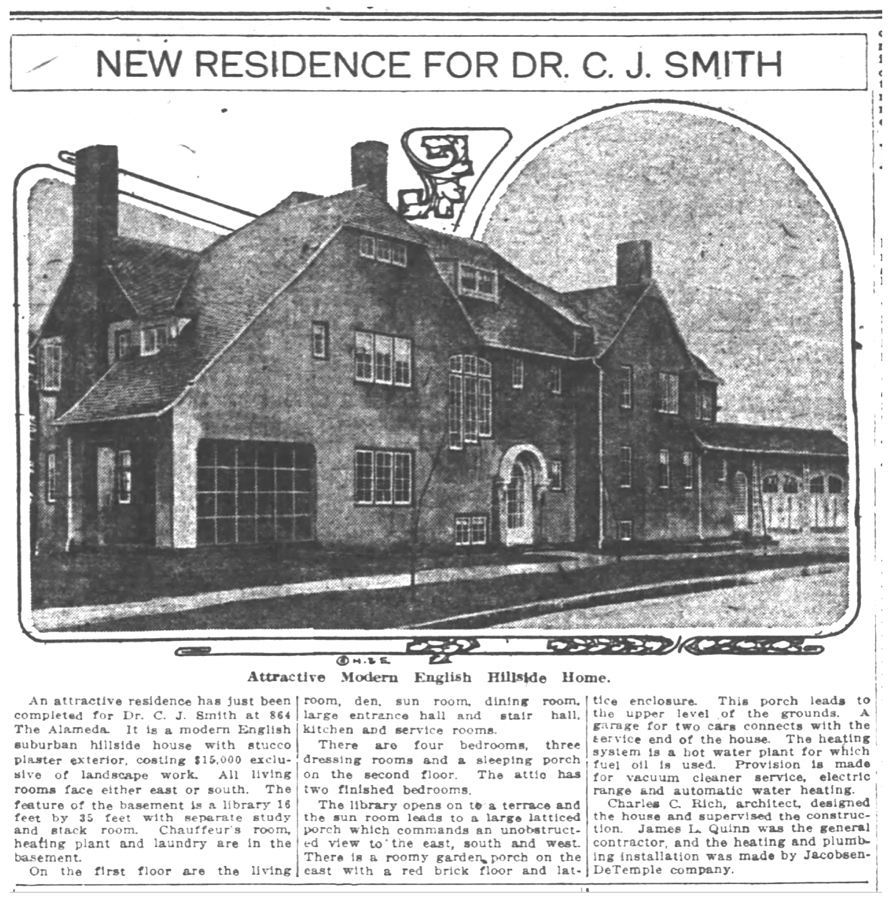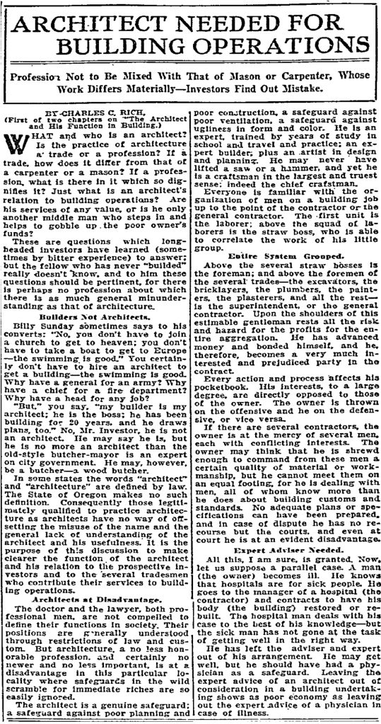 Just before receiving the commission from the Smiths, Rich was commissioned by the City of Portland to design a new city barn and stables at SW 16th and Jefferson which cost $50,000. About that time, he published a two-part series about the role of the architect in the building process which ran in The Oregonian, the Architect and Engineer of California journal, and Western Architect and Engineer magazine.