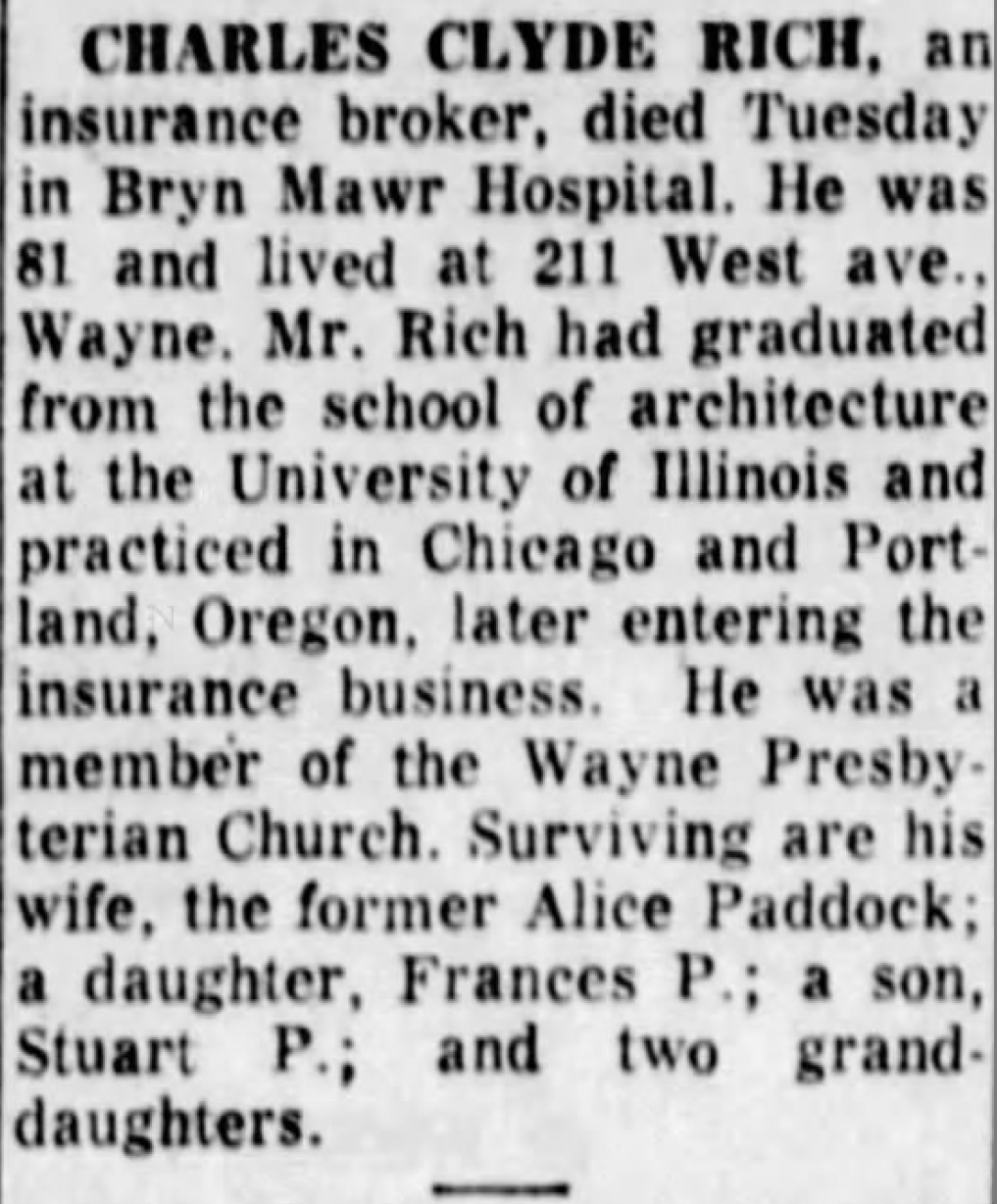 In 1920, Rich married Mary Alice Paddock and they moved to Wayne, Pennsylvania, a suburb northwest of Philadelphia where they raised a daughter and two sons. Rich had left architecture for good and continued in the insurance business. He died at age 81 on March 19, 1963.