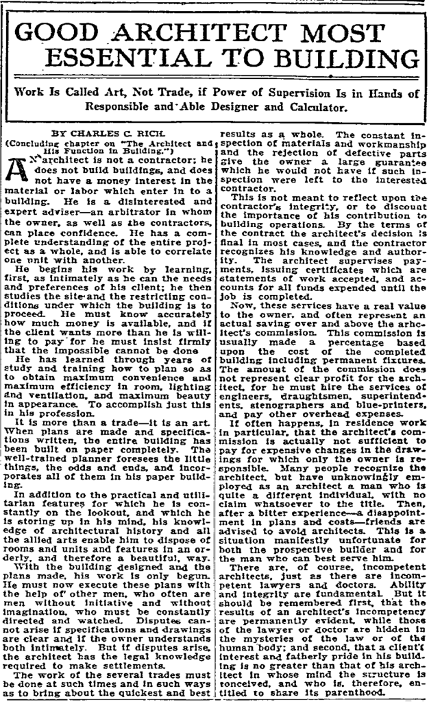Architect Charles Clyde Rich was born in Metamora, Illinois on October 1, 1881, son of Albert and Mary Ellen Rich. He graduated from the University of Illinois in 1906 with a bachelor’s of science degree in architecture and practiced briefly in Chicago.