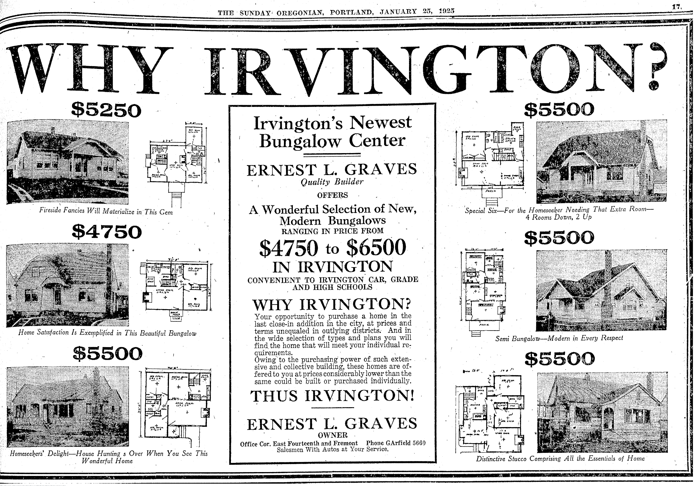 In 1925, Graves boasted of being able to build an entire section of a neighborhood, which became a thread through all of his advertising that year. He had purchased or gained interest in up to 70 empty lots on the north end of Irvington east of Irving Park and got busy with construction using a small handful of different designs.