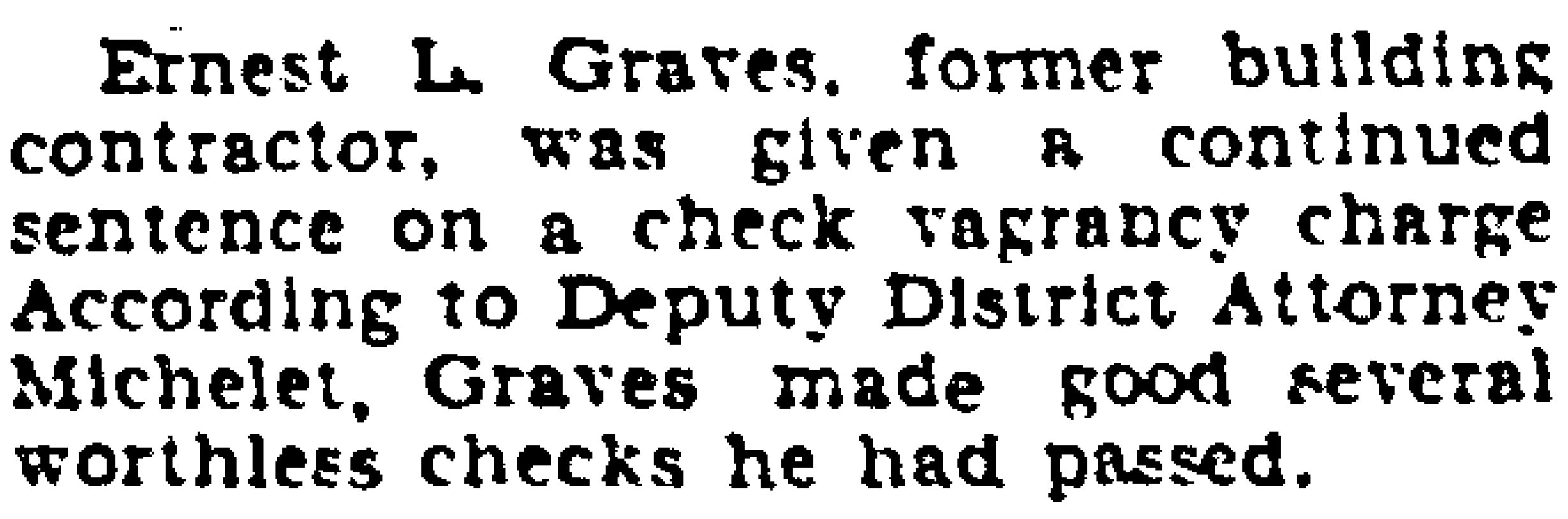 The economic crash of the Great Depression was devastating for architects and homebuilders. Leveraging significant debt was common practice for builders and developers, so that when work and homebuying ceased, many in the business were too deep in debt to recover. The only reference to Graves after 1929 is this, from the Oregon Journal on July 14, 1932: